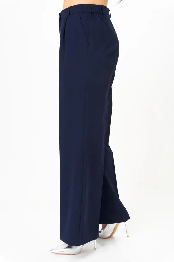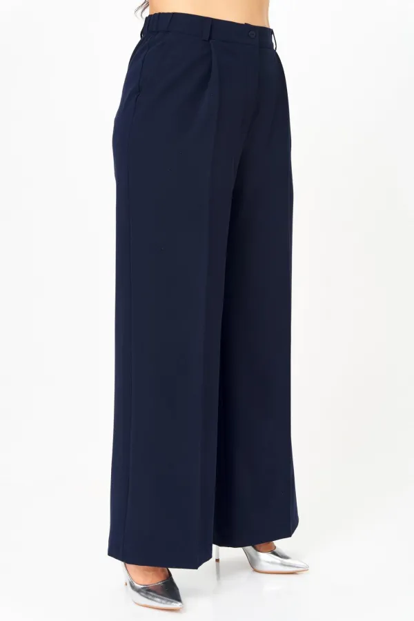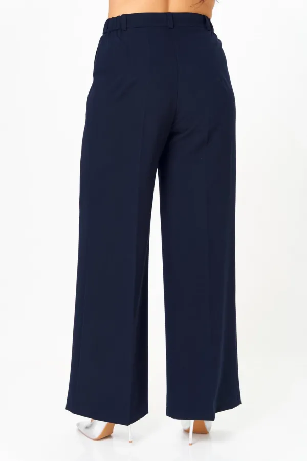 Брюки полной длины, прилегающие в области бедер и свободные в колене и по низу. Брюки со стрелками. По передним половинкам выполнены наклонные карманы. В среднем шве передней половинки обработана застежка на молнию. По задним половинкам обработаны талиевые вытачки. Брюки на притачном поясе с эластичной тесьмой и застежкой на петлю и пуговицу. На поясе обработаны шлевки для ремня.