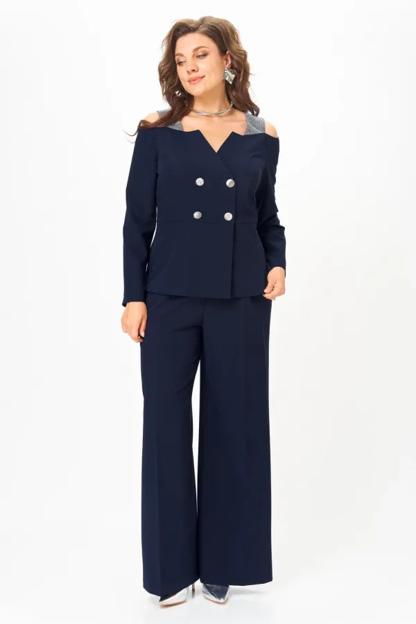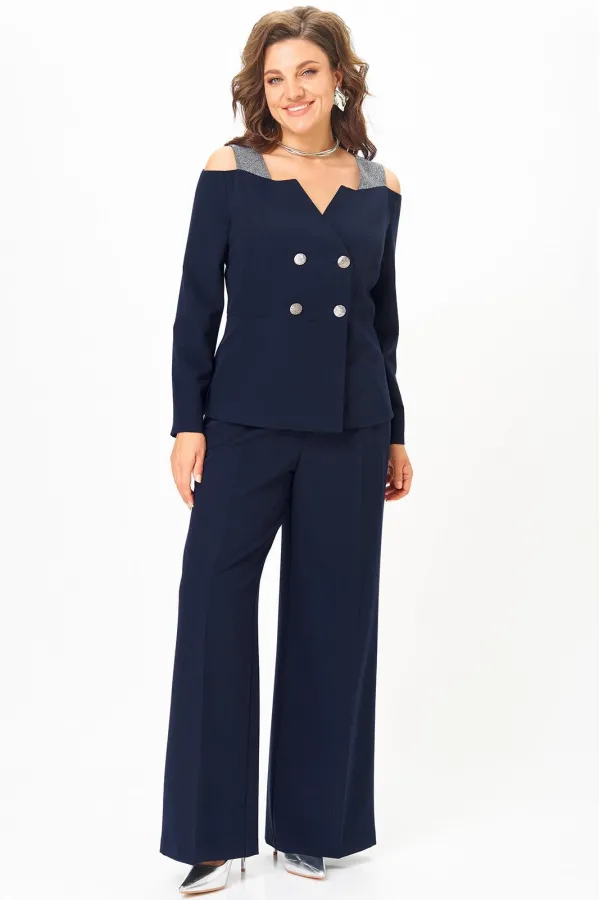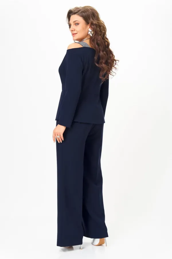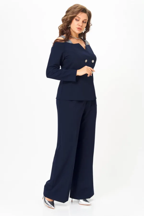 Костюм полуприлегающего силуэта, состоящий из жакета и брюк, выполнен из однотонной костюмной ткани. Ткань верха имеет механическое растяжение благодаря содержанию в ней эластана. Брючный костюм идеальный вариант на торжественные мероприятия.