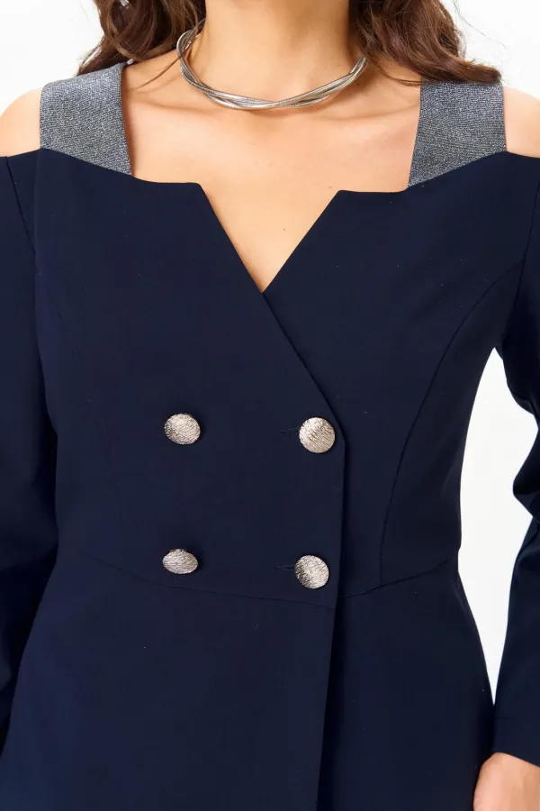Жакет полуприлегающего силуэта, без подкладки, выполнен из костюмной однотонной ткани, в качестве отделки на бретелях использован материал с люрексом, в качестве декора использованы пуговицы сочетающиеся по цвету с бретелями.