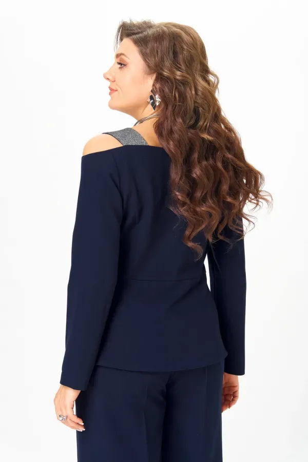 Полочка жакета с двубортной застежкой на петли и пуговицы, вертикальными рельефами. Горловина овальной формы, открывающей плечи, по центру полочки V-образный вырез. Спинка с вертикальными рельефами. В области плечевого пояса обработаны бретели. Рукав длинный, одношовный, втачной. Нижняя часть жакета притачная.