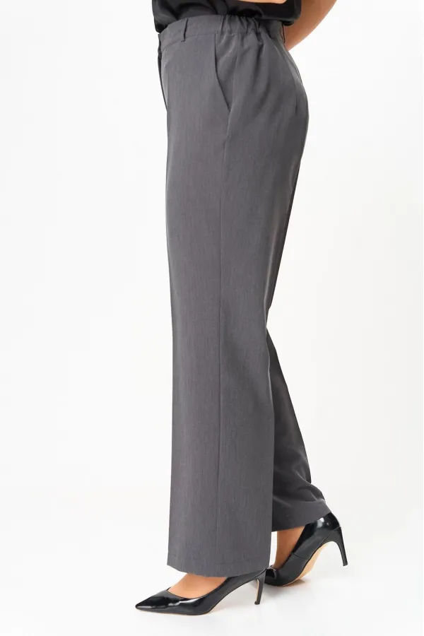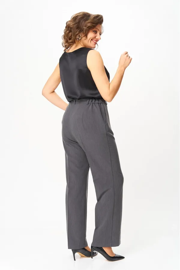 Брюки полной длины, прилегающие в области бедер и свободные в колене и по низу. Брюки со стрелками. По передним половинкам выполнены наклонные карманы. В левом боковом шве обработана застежка на потайную молнию. По талии брюки на притачном поясе с эластичной тесьмой и застежкой на петлю и пуговицу. По поясу брюк обработаны шлевки под ремень.