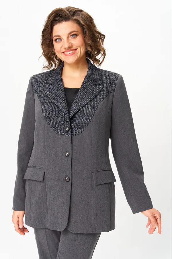 Полочка жакета с однобортной центральной застежкой на петли и пуговицы, вертикальными рельефами и прорезным карманом с клапаном. В верхней части полочки обработана фигурная кокетка из отделочной ткани. Горловина V-образной формы, с отложными лацканами и воротником пиджачного типа. Спинка со средним швом и вертикальными рельефами. Рукав длинный, двухшовный, втачной.