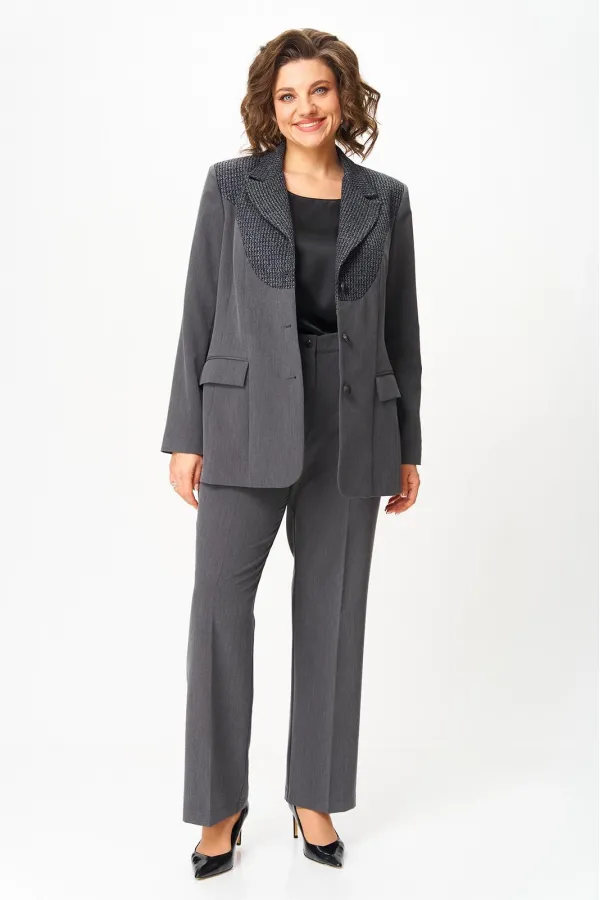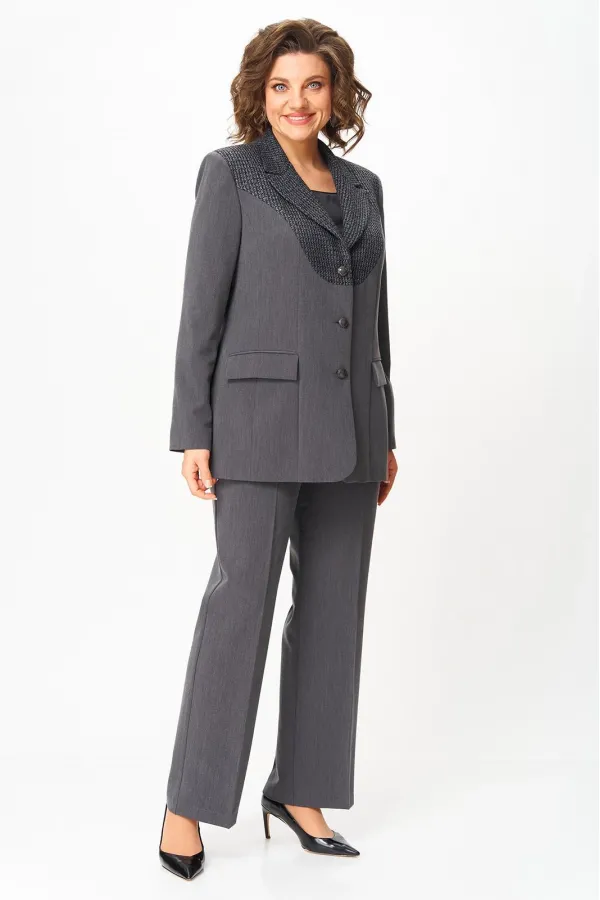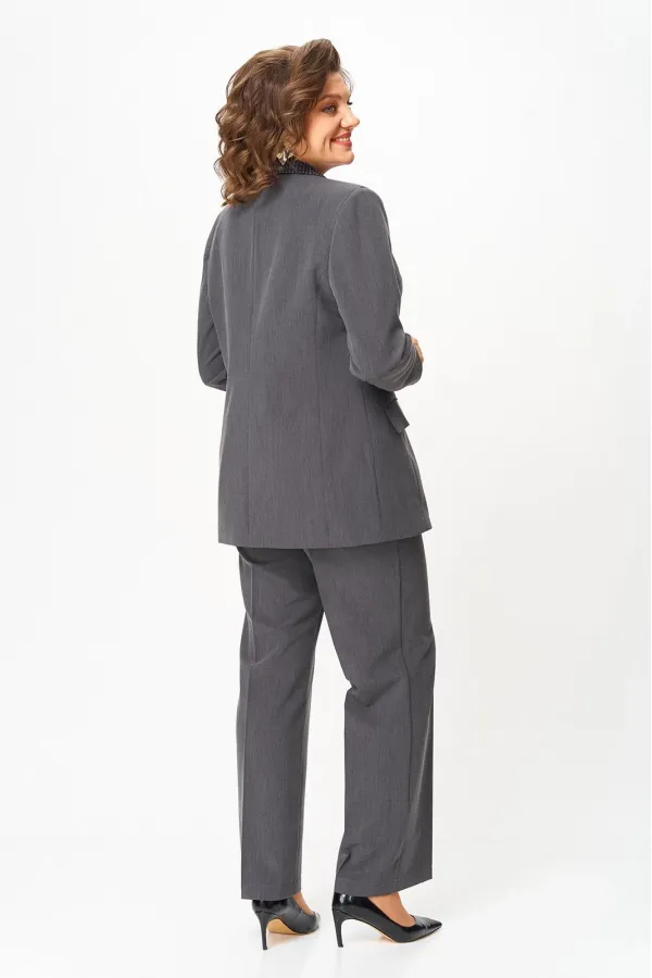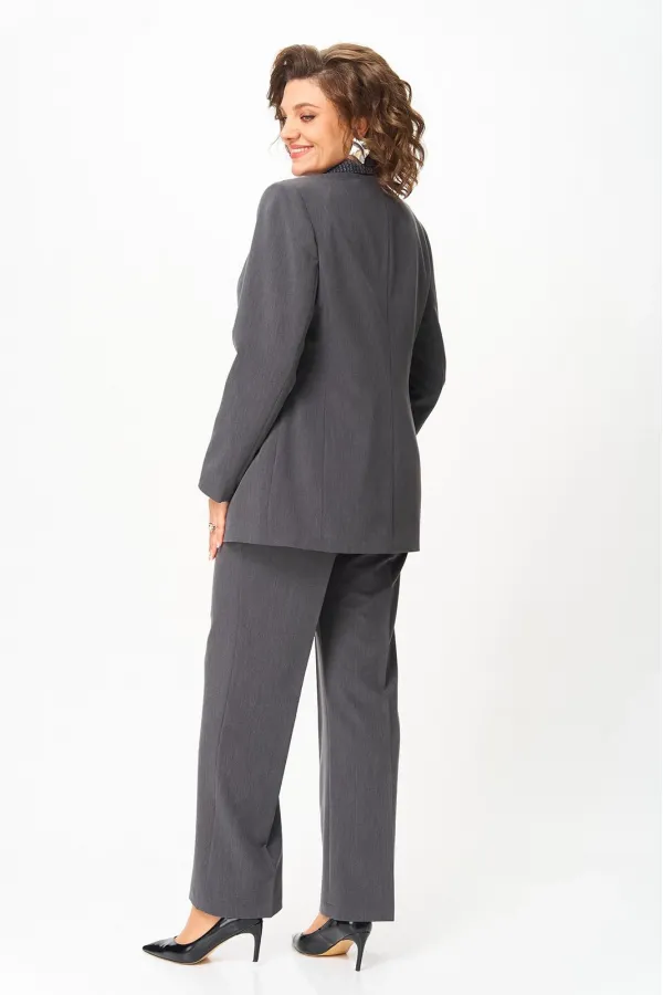 Костюм полуприлегающего силуэта, состоящий из жакета и брюк, выполнен из однотонной костюмной ткани. Ткань верха имеет механическое растяжение благодаря содержанию в ней эластана. Брючный костюм идеальный вариант как на торжественные мероприятия, так и отличный офисный вариант.