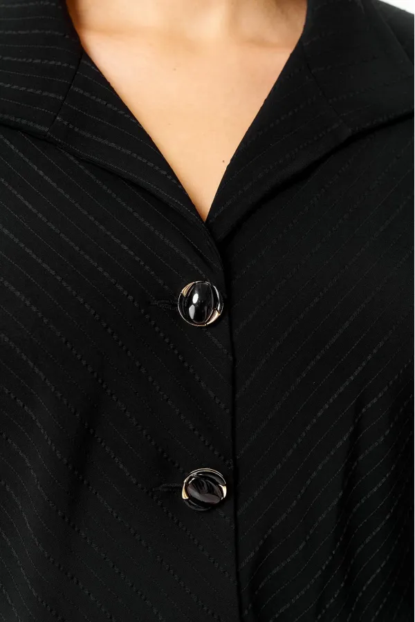 со стояче-отложным воротником. Спинка цельная. Рукав втачной, одношовный, длиной ¾. По низу рукав обработан притачной манжетой с декоративной застежкой на петлю и пуговицу.