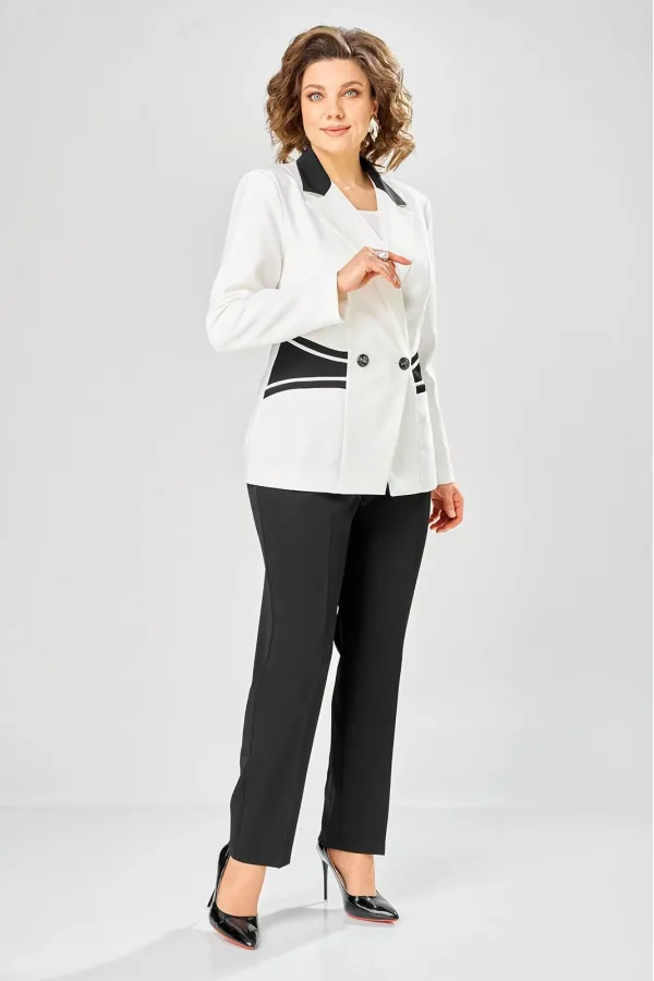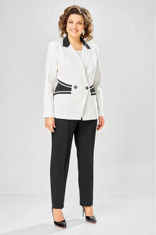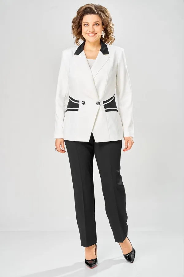 Костюм полуприлегающего силуэта, состоящий из жакета и брюк, выполнен из однотонной костюмной ткани. В качестве отделки использована однотонная ткань контрастная по цвету. Ткань верха имеет механическое растяжение, благо... Читать далее...