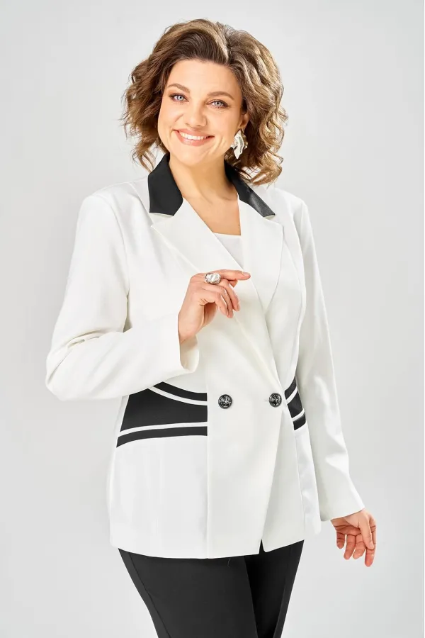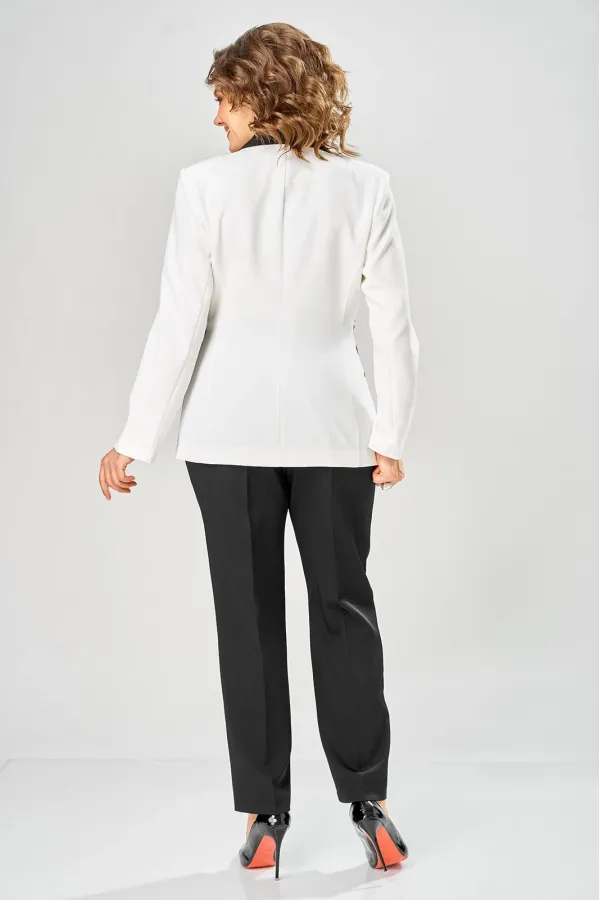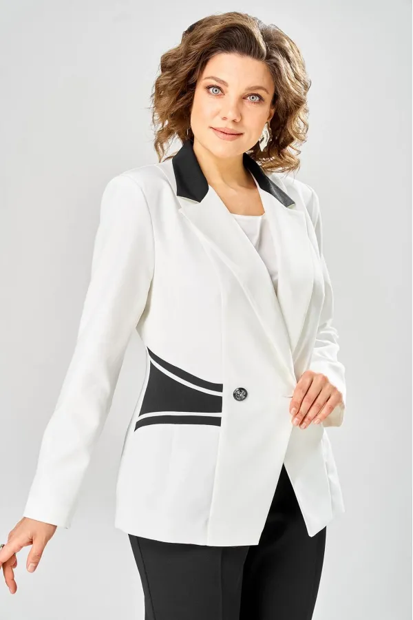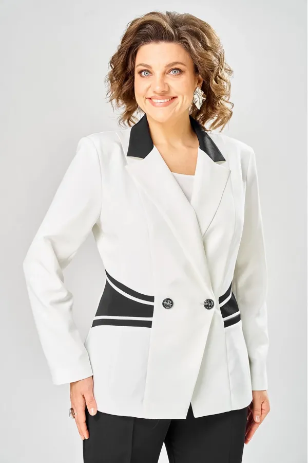 Полочка жакета с двубортной застежкой на петли и пуговицы, с вертикальными рельефами и декоративным элементом на бочках полочки. Горловина V-образной формы, с отложными лацканами и воротником пиджачного типа. Спинка со средним швом и вертикальными рельефами. Рукав длинный, двухшовный, втачной.