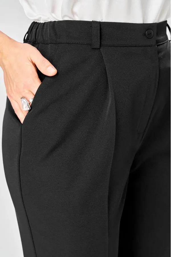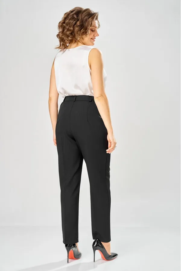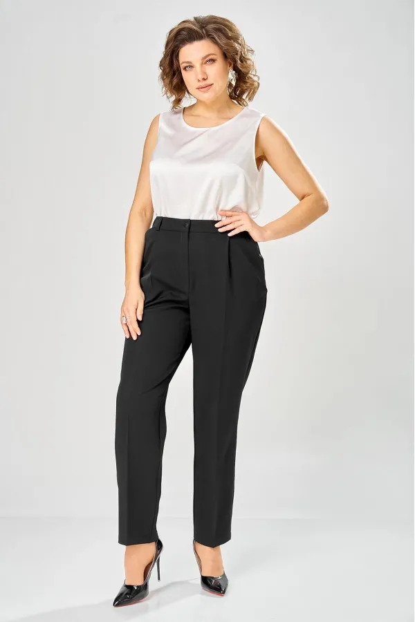 Брюки классические, полной длины, полуприлегающие в области бедер, прямые в колене и по низу. По передним половинкам выполнены наклонные карманы и складки по талии. По задним половинкам обработаны талиевые вытачки. В среднем шве по передней половинке обработана застежка на молнию. По талии брюки на притачном поясе с эластичной тесьмой и застежкой на петлю и пуговицу, пояс со шлевками.