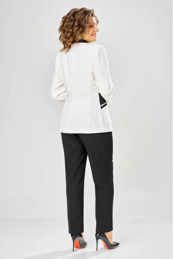 Костюм полуприлегающего силуэта, состоящий из жакета и брюк, выполнен из однотонной костюмной ткани. В качестве отделки использована однотонная ткань контрастная по цвету. Ткань верха имеет механическое растяжение, благодаря содержанию в ней эластана. Брючный костюм идеальный вариант как на торжественные мероприятия, так и отличный офисный вариант.