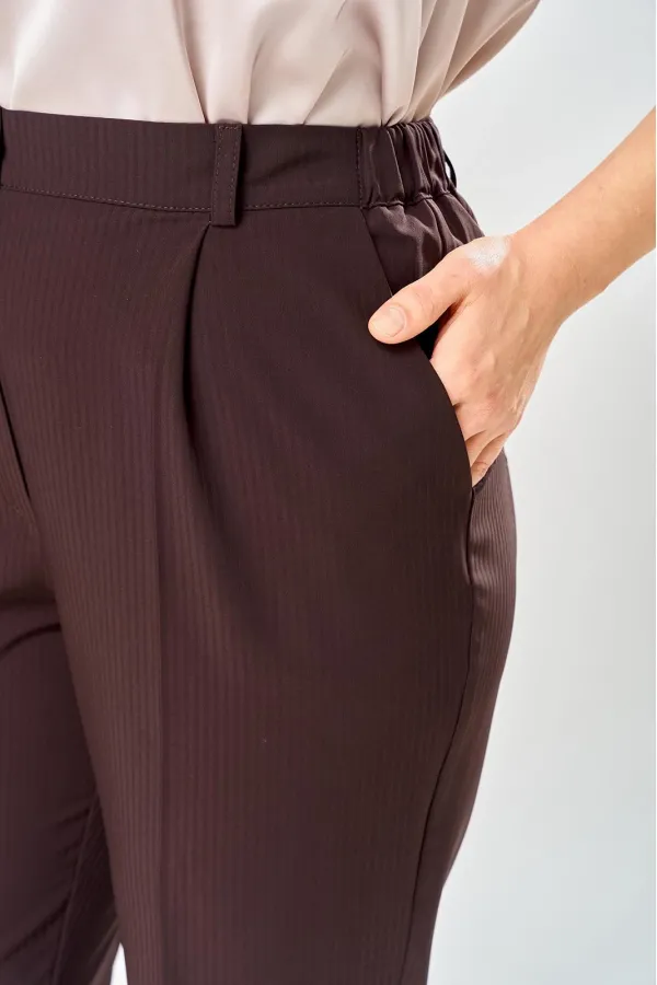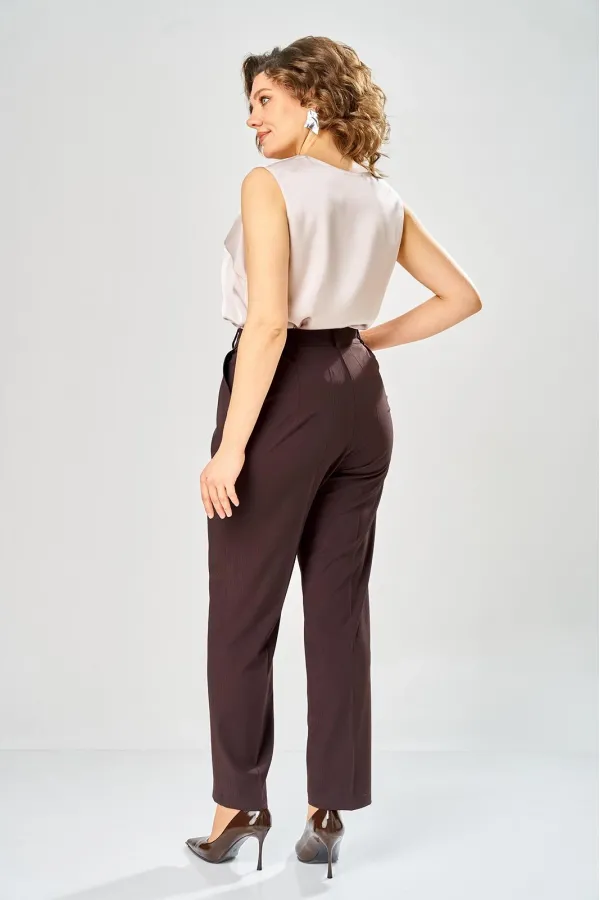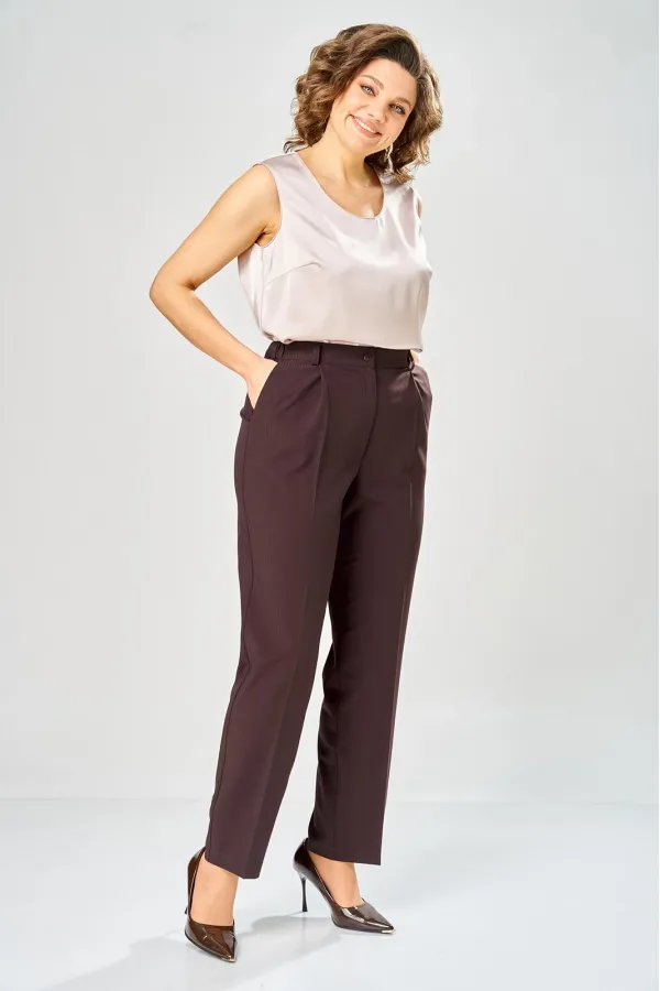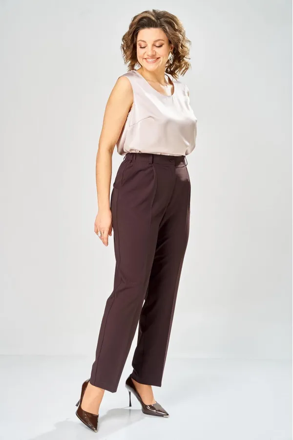 Брюки классические, полной длины, полуприлегающие в области бедер, прямые в колене и по низу. По передним половинкам выполнены наклонные карманы и складки по талии. По задним половинкам обработаны талиевые вытачки. В среднем шве по передней половинке обработана застежка на молнию. По талии брюки на притачном поясе с эластичной тесьмой и застежкой на петлю и пуговицу, пояс со шлевками.