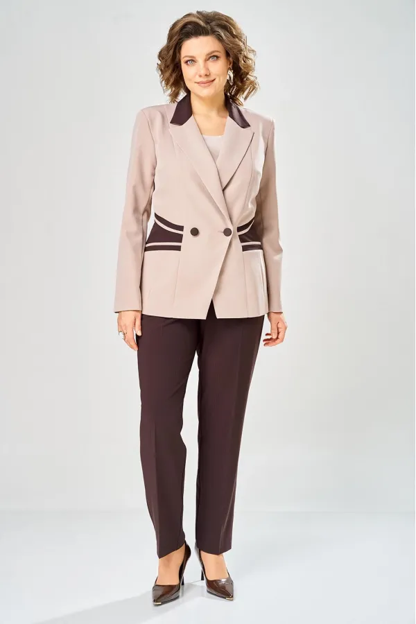 Костюм полуприлегающего силуэта, состоящий из жакета и брюк, выполнен из однотонной костюмной ткани. В качестве отделки использована однотонная ткань контрастная по цвету. Ткань верха имеет механическое растяжение, благодаря содержанию в ней эластана. Брючный костюм идеальный вариант как на торжественные мероприятия, так и отличный офисный вариант.