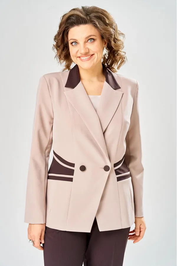Полочка жакета с двубортной застежкой на петли и пуговицы, с вертикальными рельефами и декоративным элементом на бочках полочки. Горловина V-образной формы, с отложными лацканами и воротником пиджачного типа. Спинка со средним швом и вертикальными рельефами. Рукав длинный, двухшовный, втачной.