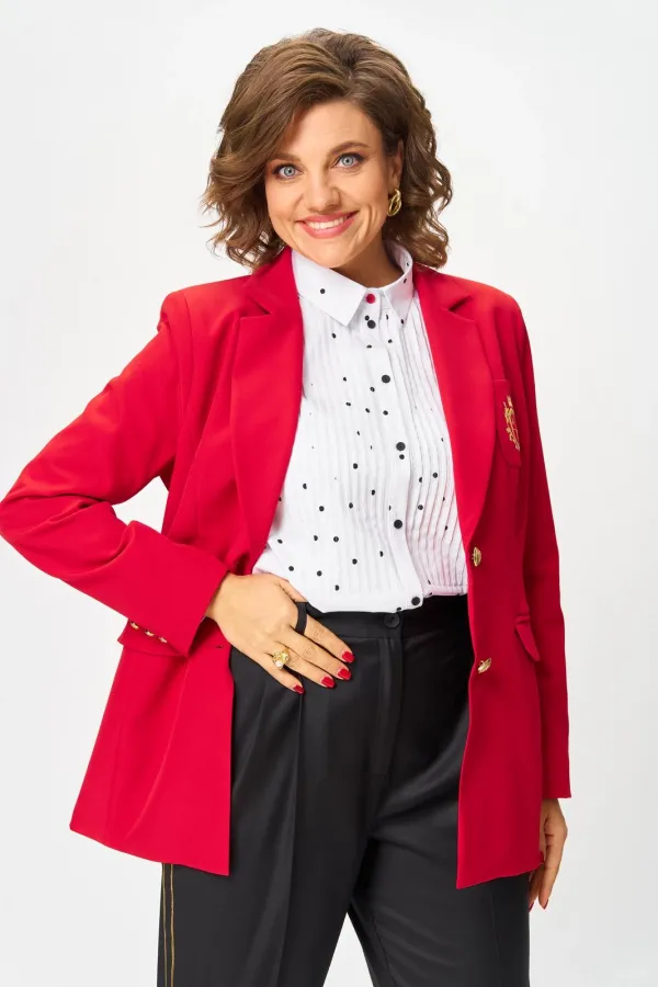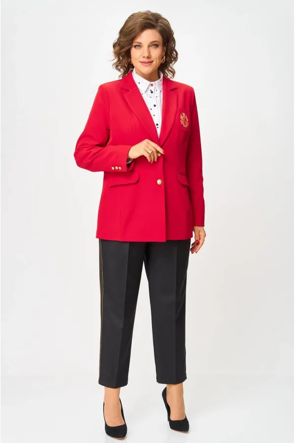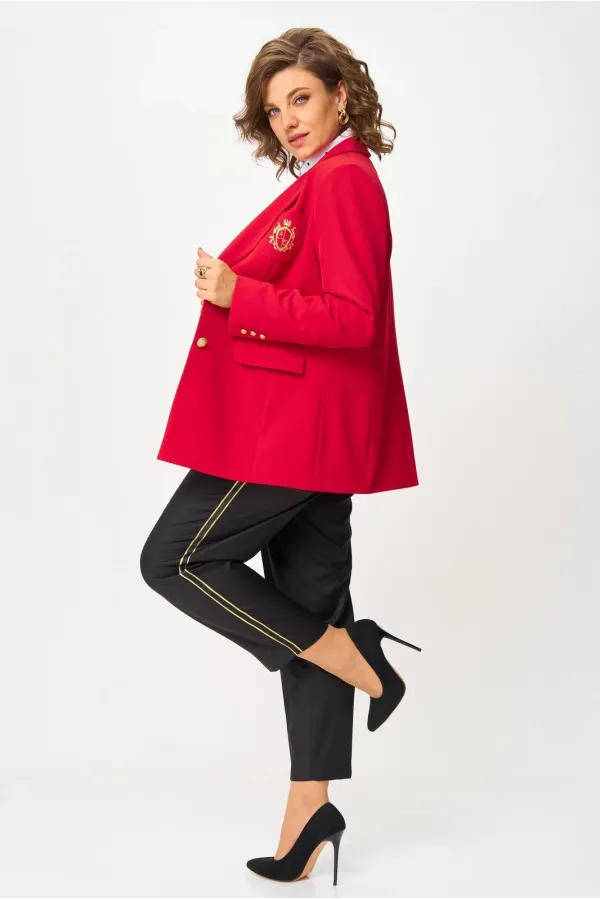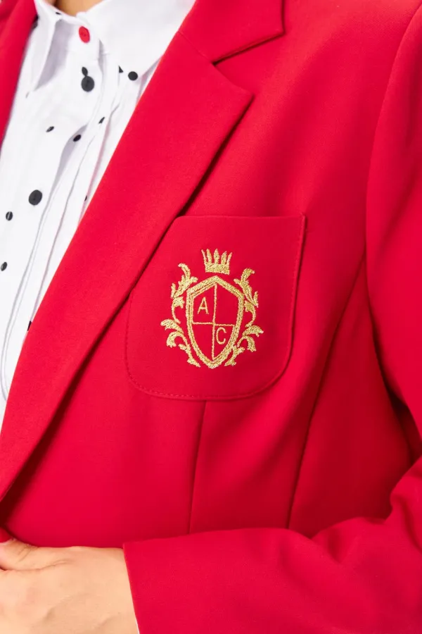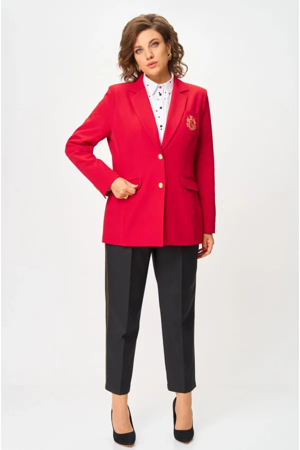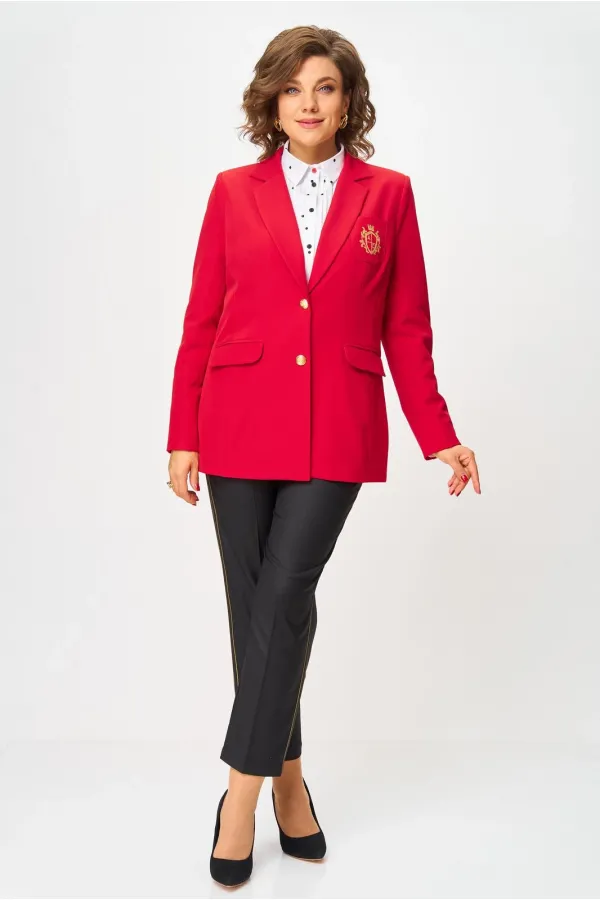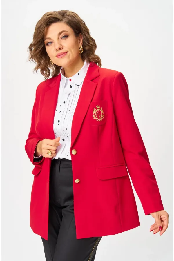 Прекрасный, стильный, яркий женский жакет не оставит равнодушной ни одну модницу! Полуприлегающий классический покрой подчеркнет достоинства фигуры. Жакет с застёжкой спереди на петли и пуговицы, с пиджачным воротником и втачными двухшовными рукавами. По переду выполнены боковые прорезные карманы с клапанами и нагрудный накладной карман с дизайнерской фирменной вышивкой, спинка со швами.