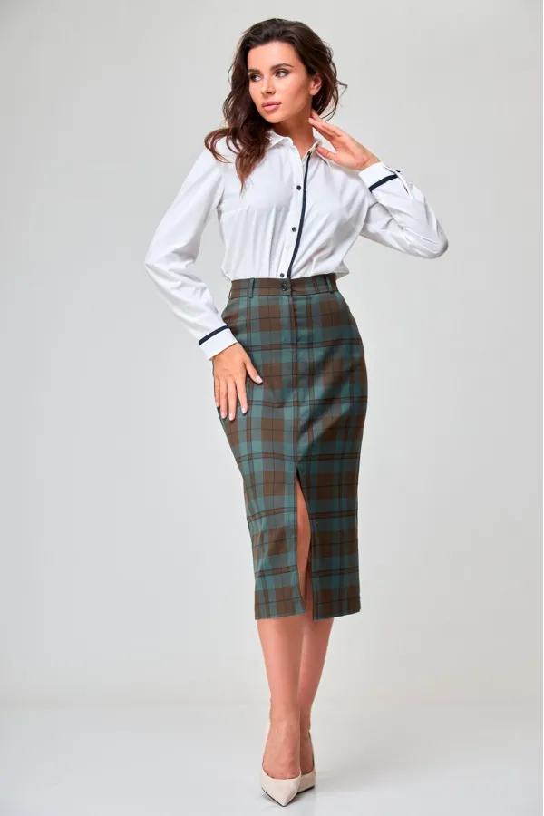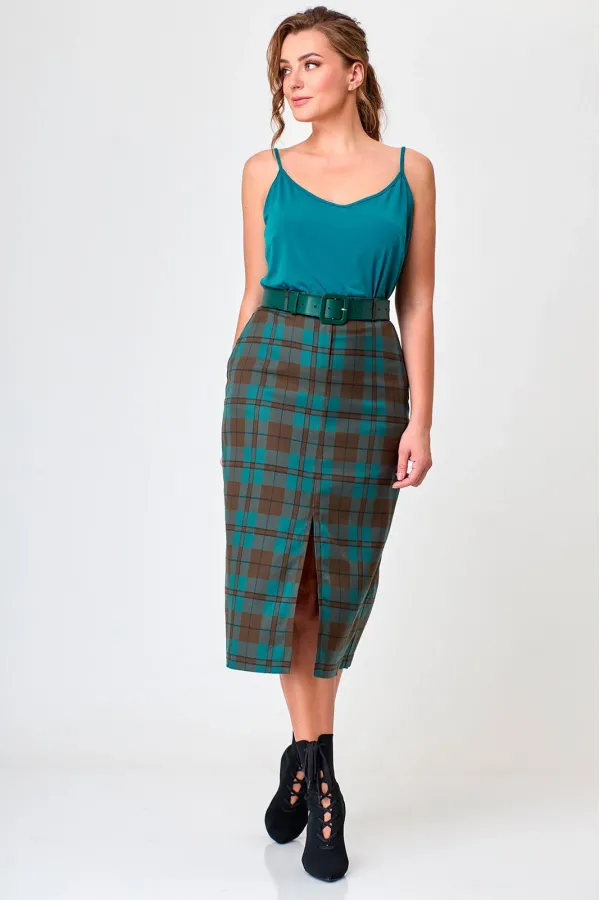 Юбка карандаш, длина миди. По среднему шву переда игривый женственный разрез и застежка на гульфик с молнией. Пояс на петлю пуговицу.