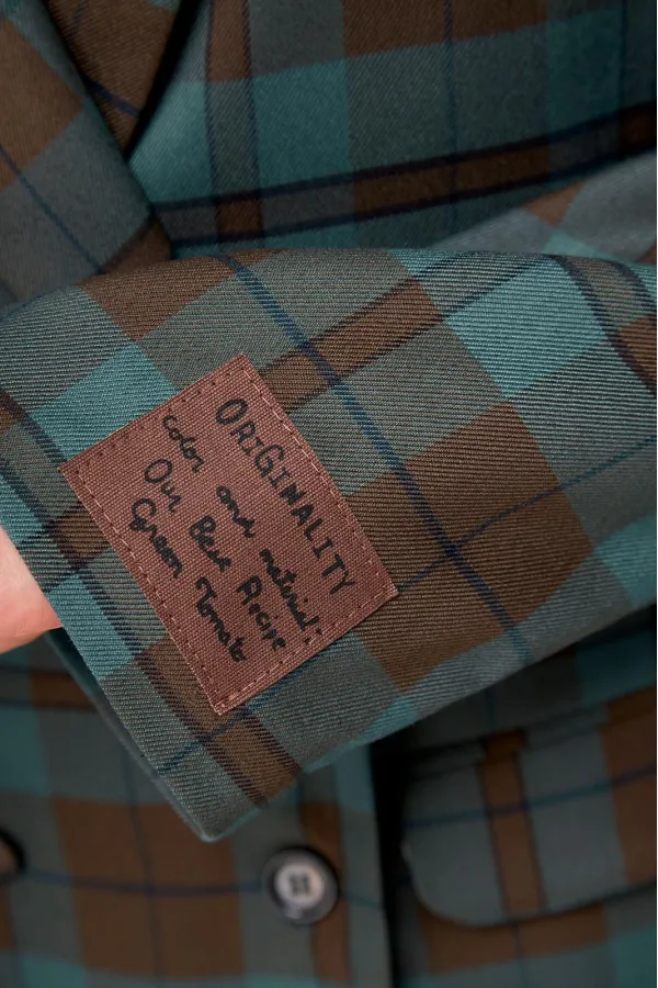 Жакет женский прямого силуэта, длиной до середины бедра. Рукав втачной, длинный, с декоративной нашивкой на левом рукаве (при необходимости её можно легко отпороть). Жакет двубортный, по переду прорезной карман с клапаном. Талиевые вытачки по переду и спинке. Горловина обработана классическим жакетным воротником с лацканом.