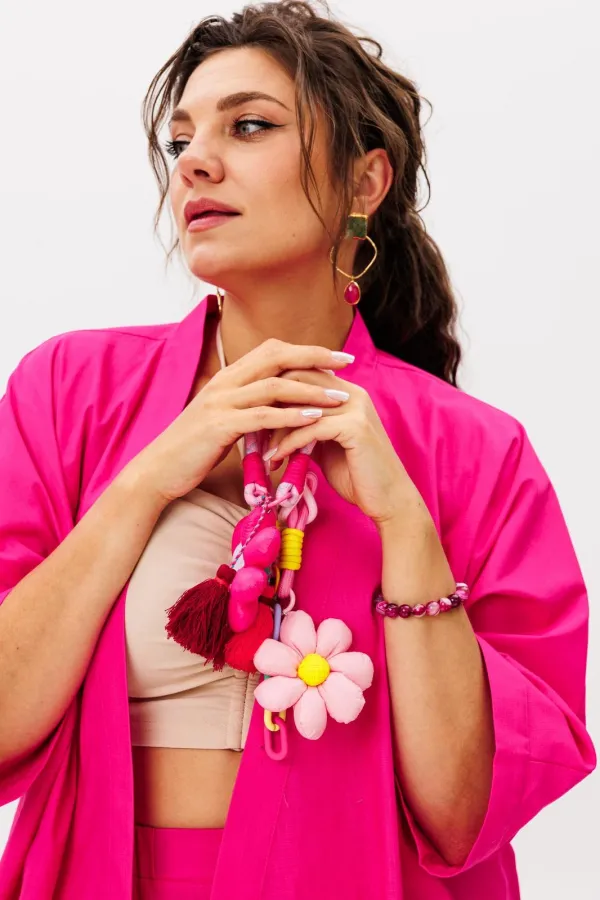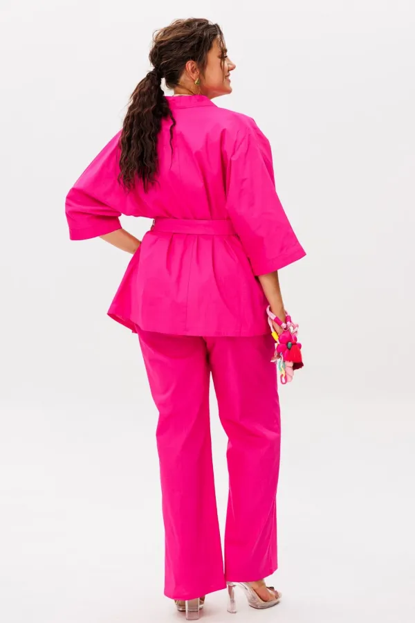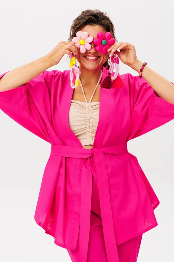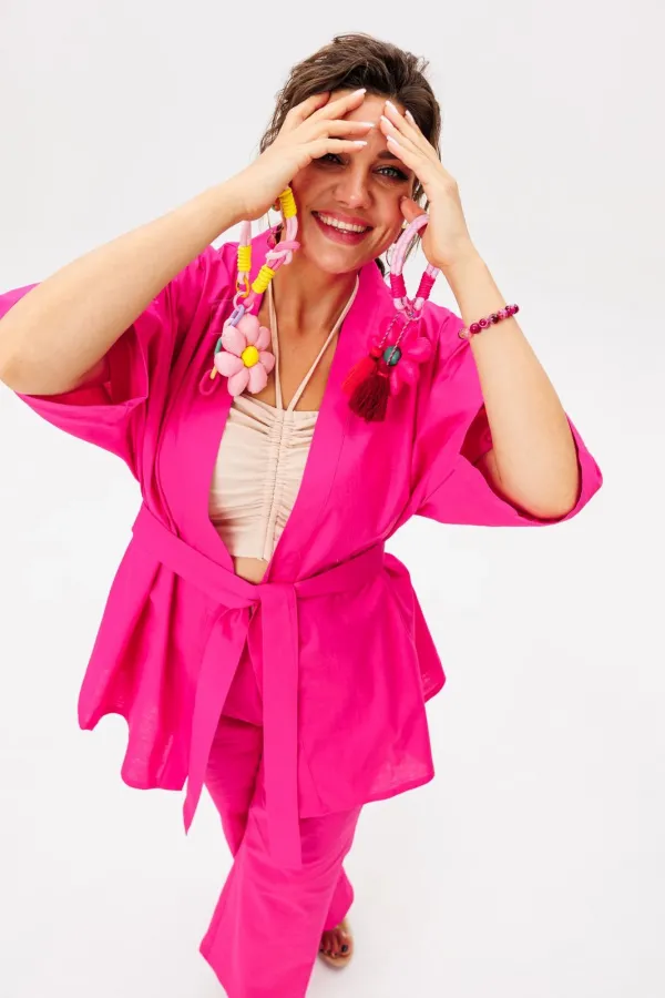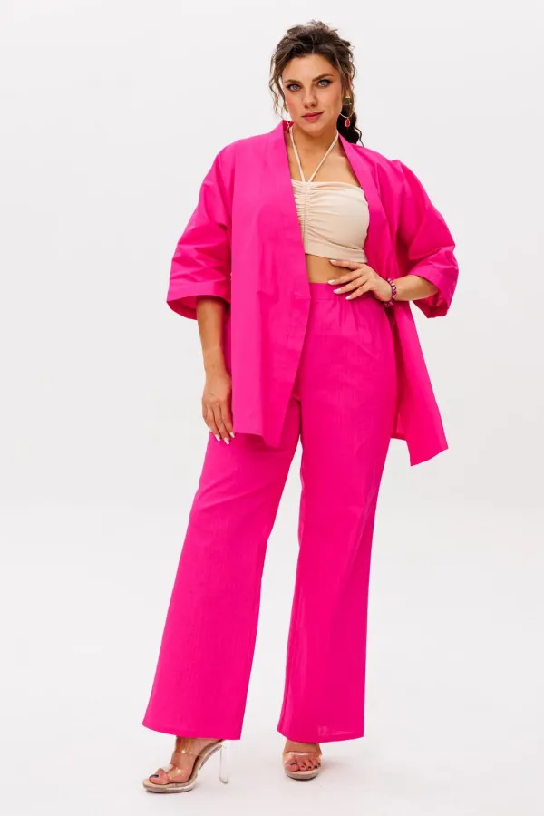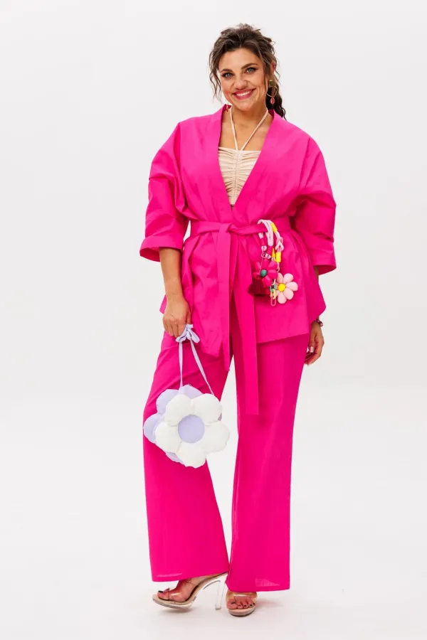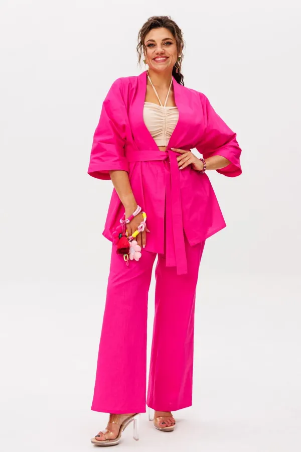 «Малиновый щербет» — цвет, который говорит сам за себя. И это не просто костюм, а готовое настроение — лёгкое, солнечное, без лишних слов. Кимоно свободного кроя с фигурным запахом мягко драпируется, подчёркивая силуэт, ... Читать далее...