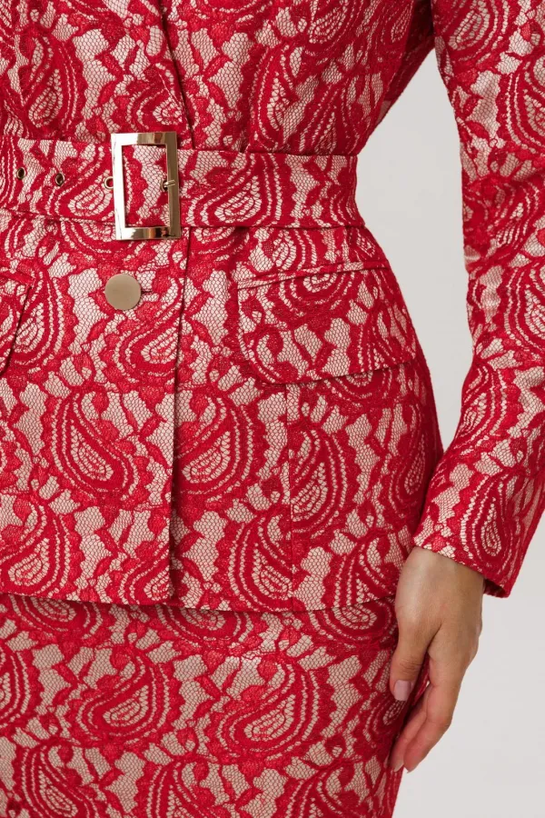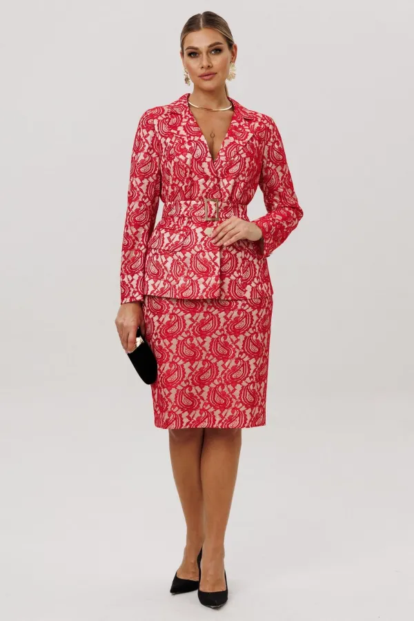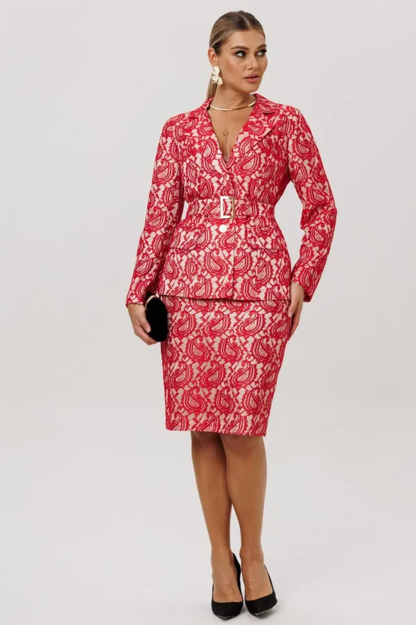 Костюм выполнен в ярком цвете китайский красный — цвете, который сочетает в себе женственность, уверенность и одновременно нежность.