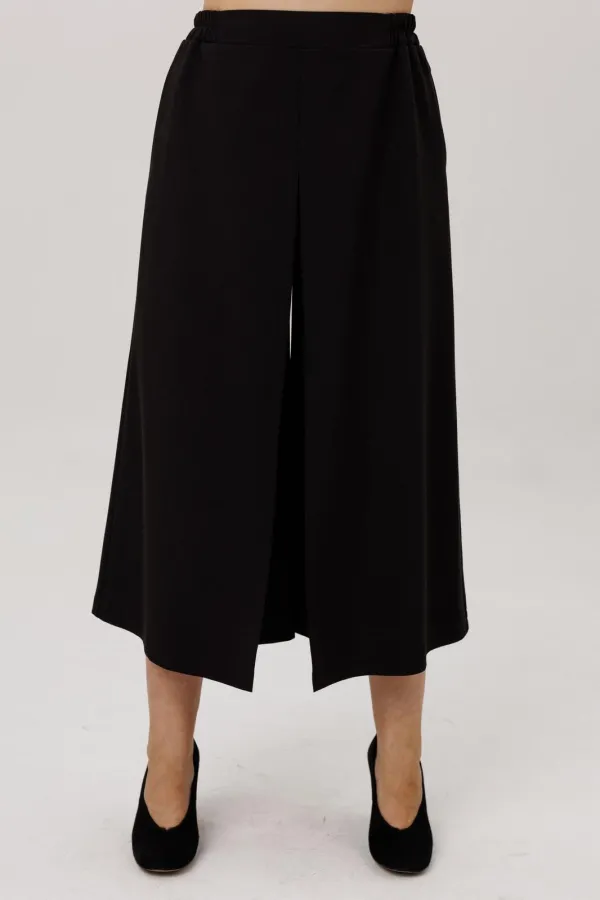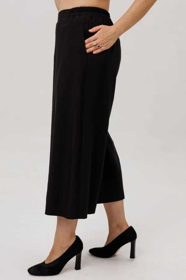 К этому воздушному объёму вступает в диалог решительная лёгкость юбки-кюлотов, парящей на грани изящной юбки и уверенных брюк. Её струящаяся ткань мягко обозначает талию и плавно расширяется книзу, создавая элегантный и динамичный фасон, который движется вместе с вами. Пояс на резинке дарят комфорт, а фигурные карманы добавляют тонкий акцент индивидуальности.