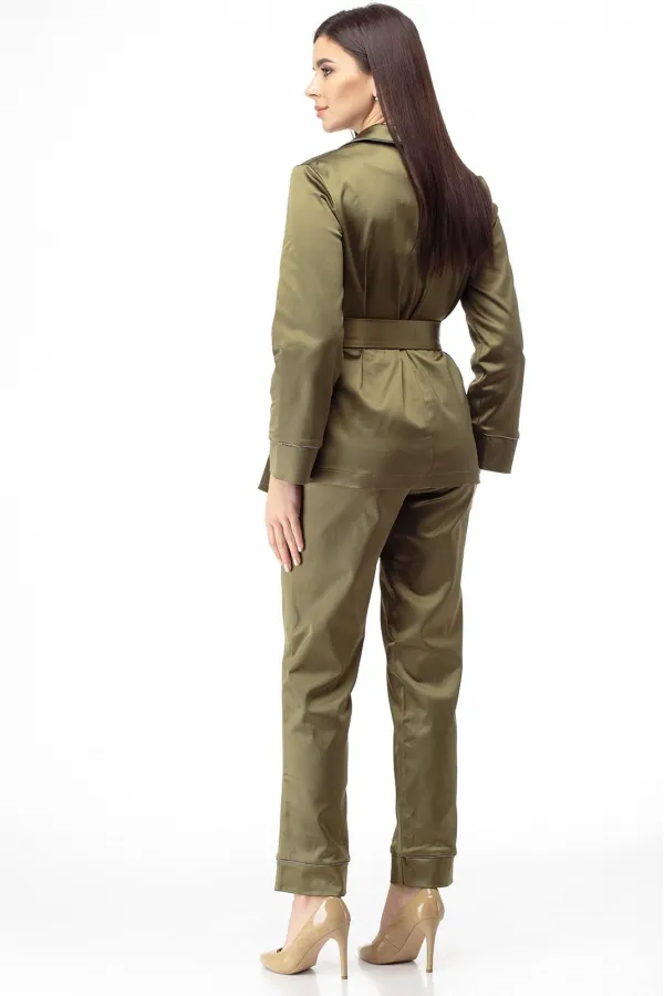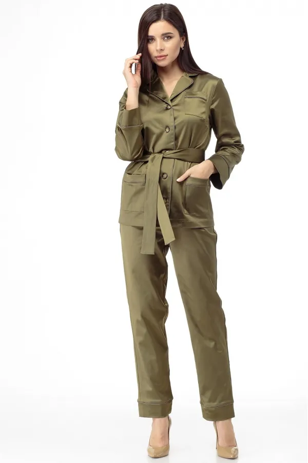 Элегантный воротник пиджачного типа, притачные манжеты по низу рукавов и низу брюк с отделкой кантом придают изделию особый изыск.