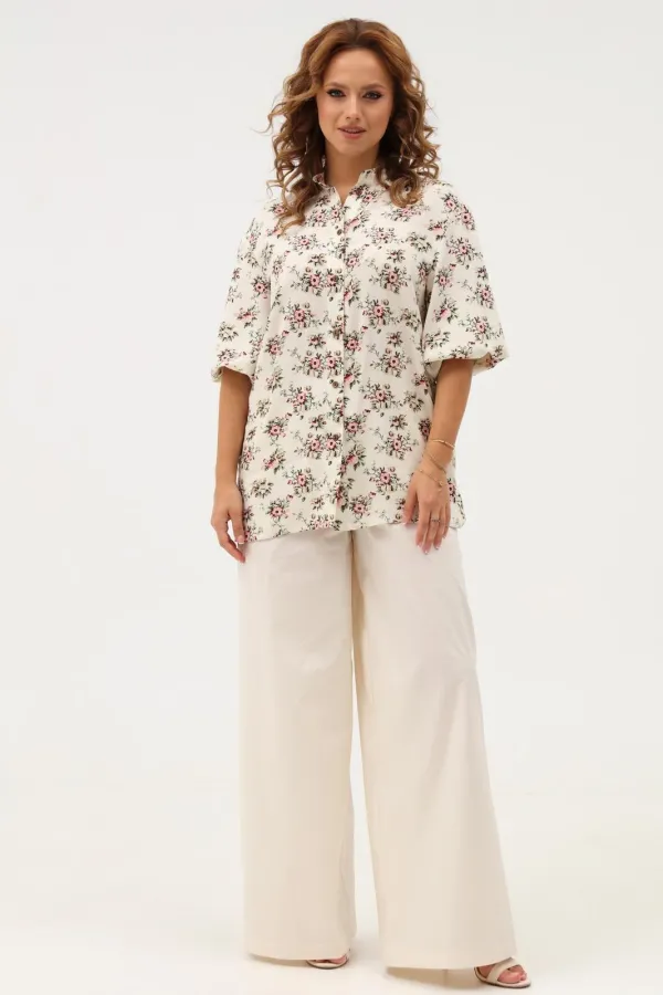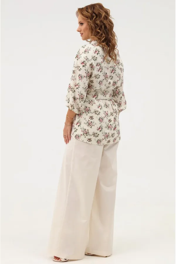 Летний женский комплект-двойка состоит из легкой удлиненной блузки и широких брюк-палаццо. Комплект изготовлен из хлопковых тканей, что позволит телу дышать и прекрасно подойдет для летнего сезона.