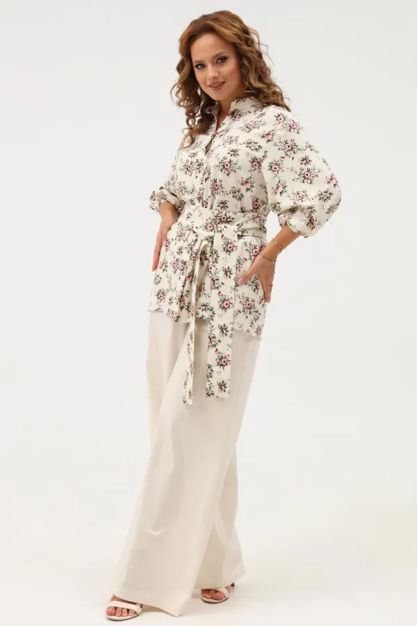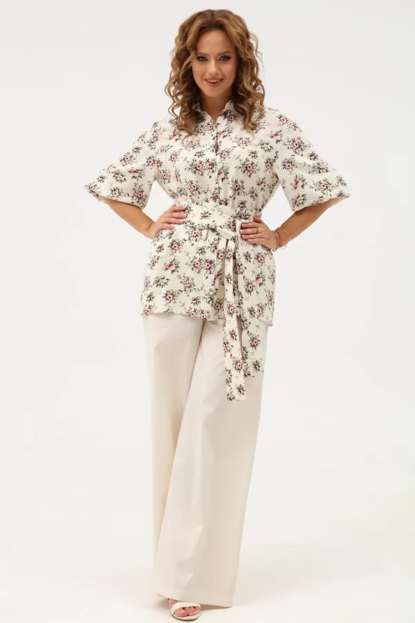 Блузка свободного силуэта. Воротник-стойка. По переду расположена центральная застежка на петли и пуговицы. Спинка с кокеткой. Рукав втачной короткий, со сборкой по низу. Для подчеркивания талии в комплекте идет съемный пояс из основной ткани.