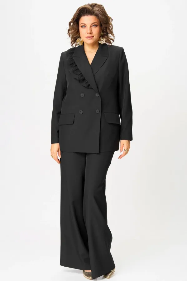 Жакет прямого силуэта, на подкладке. По переду - центральная двубортная застежка на петли и пуговицы, нагрудные вытачки и функциональные прорезные карманы с клапаном. Полочку жакета украшает съемная (на пуговицах) декоративная рюша с кружевом. Спинка со средним швом. Рукав втачной длинный двухшовный, с имитацией шлицы, декорированной пуговицами.