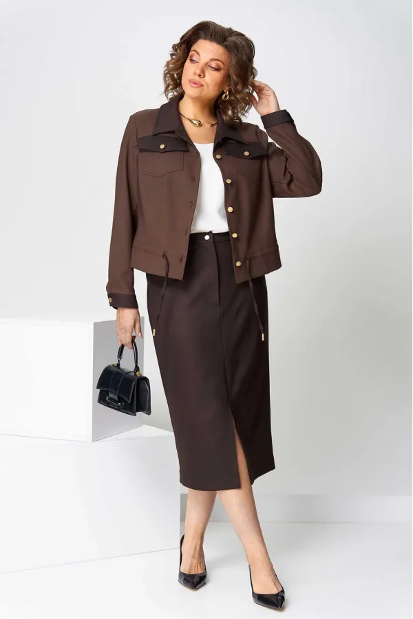 Костюм юбочный (двойка) женский свободного силуэта, состоит из жакета и юбки. Жакет без подкладки с центральной застежкой на петли и пуговицы, воротник отложной, рукав длинный с манжетом, застегивающимся на петлю. По спи... Читать далее...