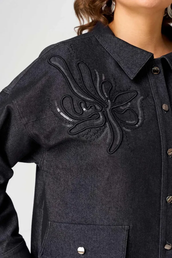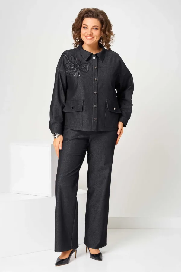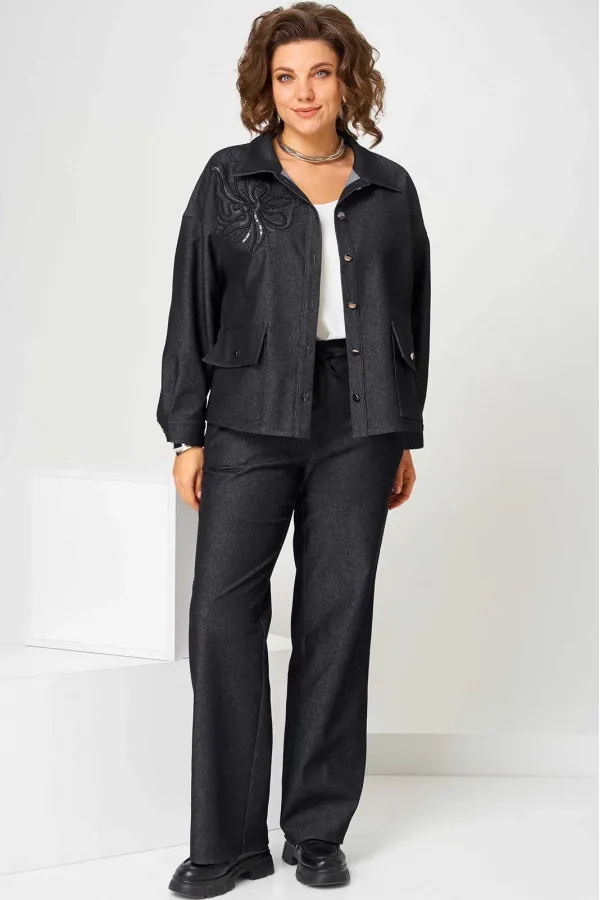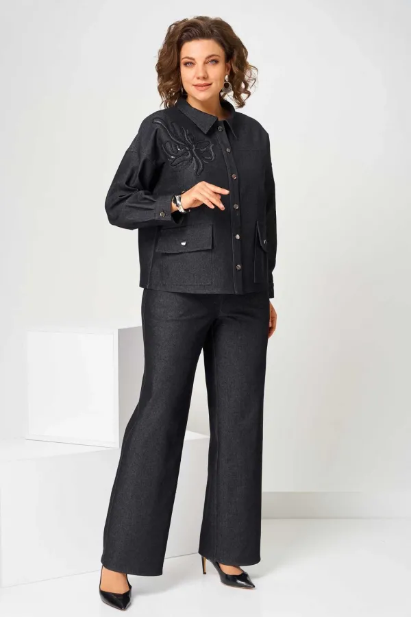 Костюм брючный (двойка) женский свободного силуэта, состоит из жакета и брюк. По переду жакета кокетка с вышивкой. Жакет свободного кроя со спущенным рукавом с манжетом. Карманы на жакете накладные с клапаном. Застежка ц... Читать далее...