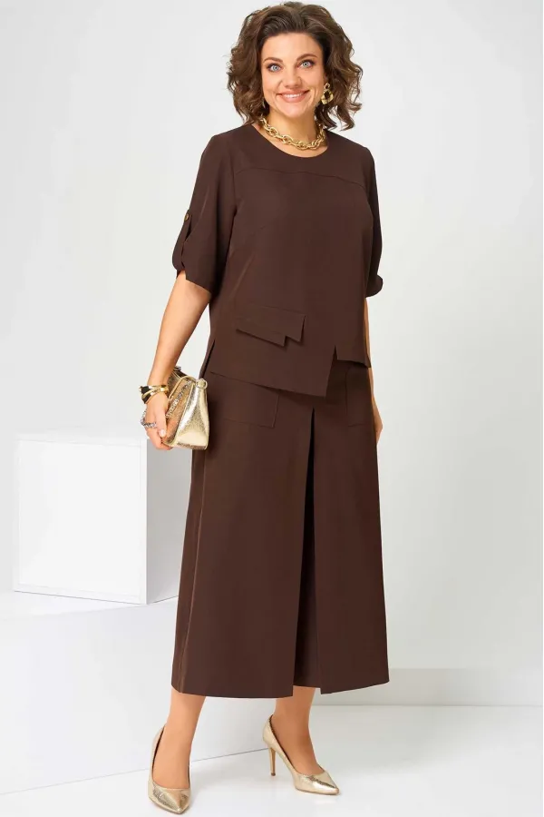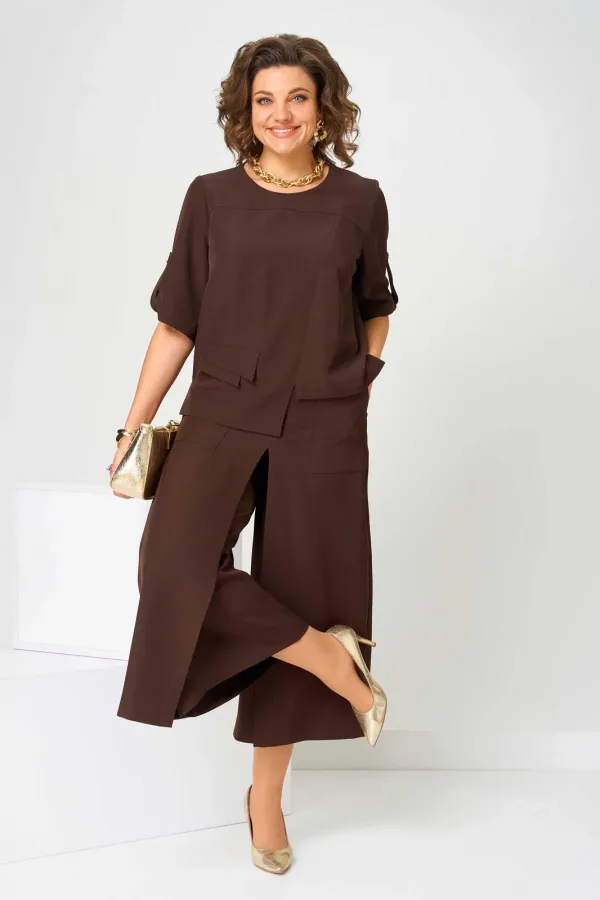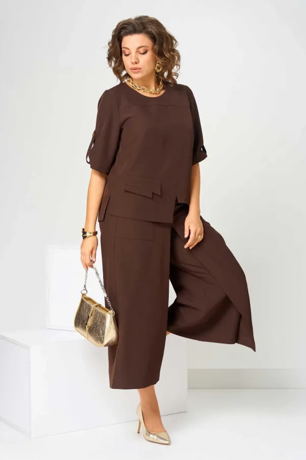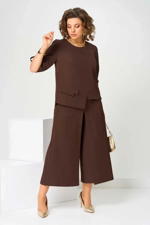 Костюм женский свободного силуэта, выполнен из костюмной ткани. Блузка с рукавами 7/8. Перед с ассиметричной кокеткой и рельефом, ниже уровня талии фигурный клапан. Спинка свободная. Низ блузки фигурный разноуровневый. Юбка-брюки на кокетке, с накладными карманами. Застежка на тесьму-молнию в боковом шве.