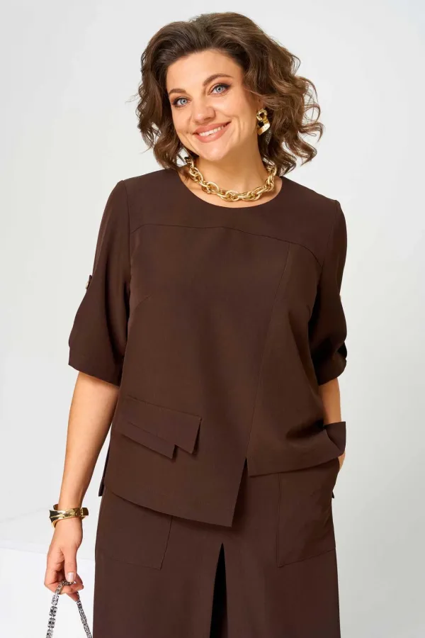 Костюм женский свободного силуэта, выполнен из костюмной ткани. Блузка с рукавами 7/8. Перед с ассиметричной кокеткой и рельефом, ниже уровня талии фигурный клапан. Спинка свободная. Низ блузки фигурный разноуровневый. Ю... Читать далее...
