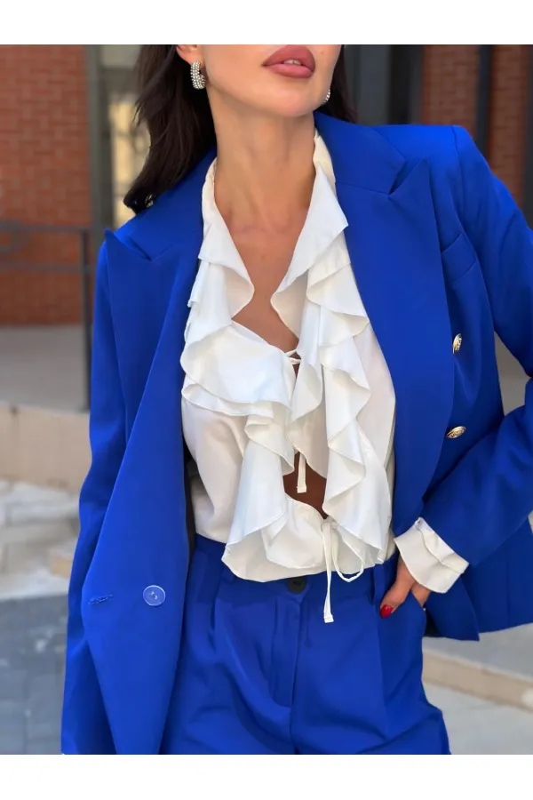 Костюм 2-предметный: жакет и брюки. Двубортный жакет на подкладке, прямого силуэта. Обработаны прорезные карманы по переду. Рукава втачные одношовные, обработаны шлицей. Брюки прямого кроя, длинна 7/8, застёжка- гульфик , по боковым вам обработаны карманы.