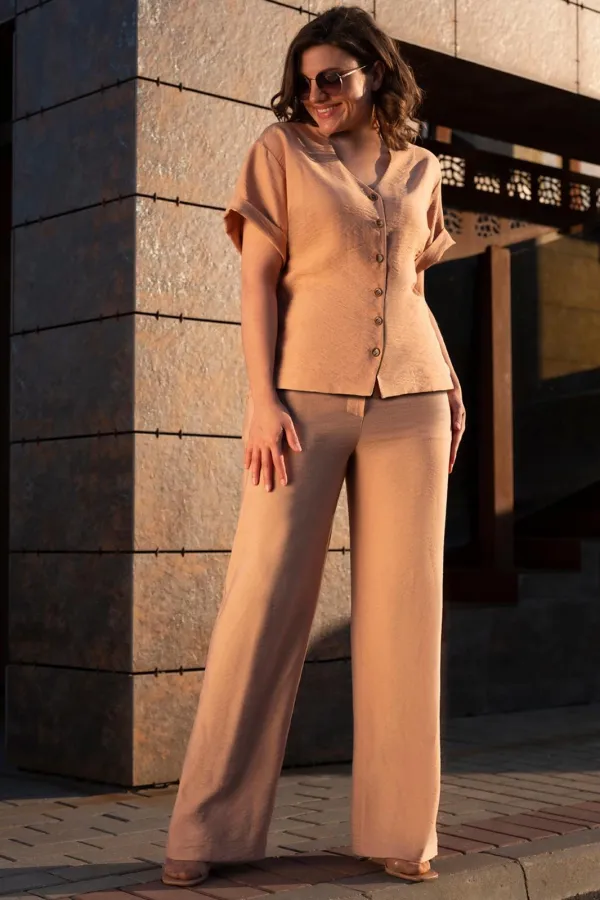 Комплект двойка: брюки+блузка. Брюки классические, ткань плательно-блузочная. Застежка на молнию спереди, на переде карманы. Блузка свободного кроя, застежка на пуговицы спереди. Рукав втачной на спущенной пройме. Длина ... Читать далее...