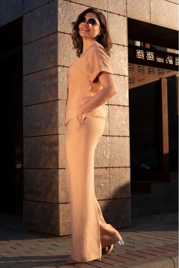 Комплект двойка: брюки+блузка. Брюки классические, ткань плательно-блузочная. Застежка на молнию спереди, на переде карманы. Блузка свободного кроя, застежка на пуговицы спереди. Рукав втачной на спущенной пройме. Длина блузы 58 см, длина брюк 116 см.