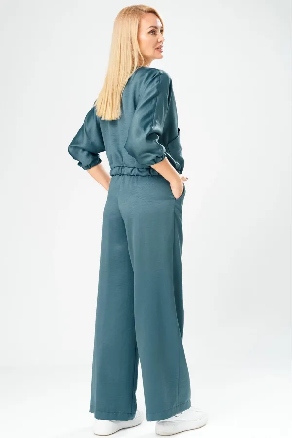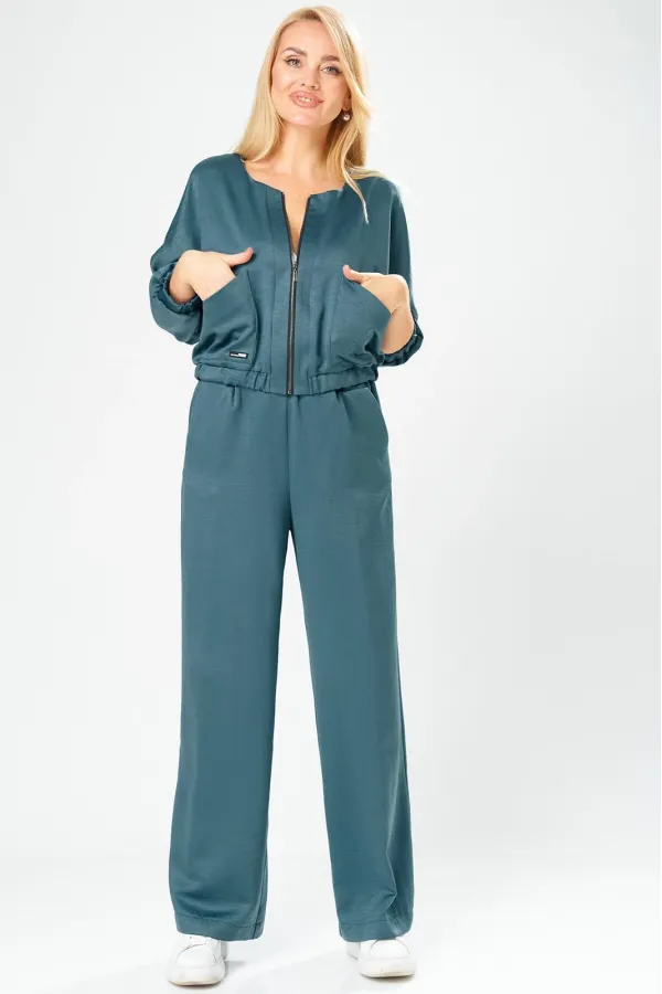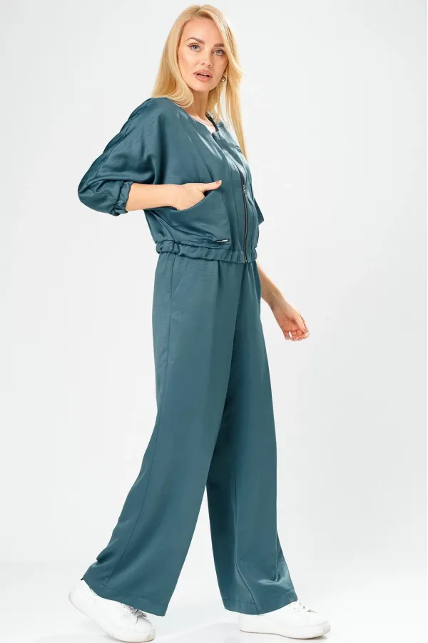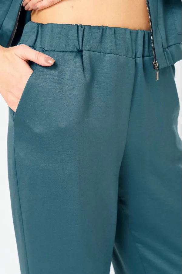 Брючный комплект в городском стиле идеально подойдет для тех, кто ценит комфорт и стиль. Он выполнен из мягкого, уютного сатина, приятного к телу, не мнется, что позволит сохранить опрятный вид в течении дня. Комплект состоит из широких брюк и укороченного бомбера на молнии, декорированного накладными карманами. Свободные брюки с поясом на резинке в стиле палаццо визуально стройнят и вытягивают фигуру, а также обеспечивают свободу движения и удобство. В боковых швах брюк выполнены удобные функциональные карманы.