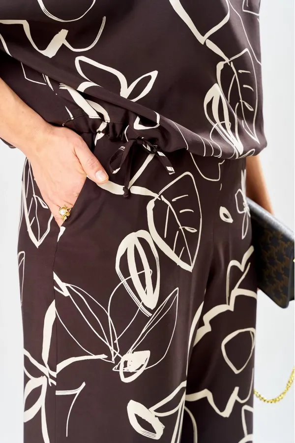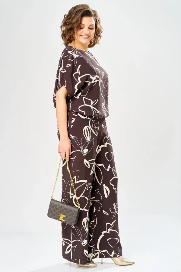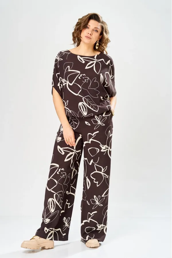 Стильный брючный комплект в трендовом цвете шоколад идеально впишется в Ваш весенне-летний гардероб. Костюм свободного кроя выполнен из высококачественной 100% вискозы. Удобные свободные брюки с поясом на резинке идеально сидят на фигуре и визуально стройнят и вытягивают фигуру. В боковых швах брюк выполнены функциональные карманы. Блуза прямого силуэта, свободного кроя со спущенным плечом. Низ блузы обработан кулисой, что позволит Вам регулировать ширину блузы по низу, в зависимости от Ваших индивидуальных обхватов.
