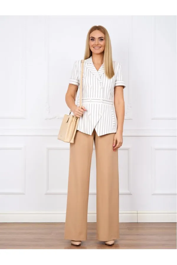 Комплект женский, состоящий из жакета и брюк .Жакет прилегающего силуэта, с коротким рукавом ,отрезной по линии талии ,2-бортный с застежкой на петли и пуговицы ,с отложным воротником с лацканами ,по переду в рельефах -карманы с листочкой , спинка так же с втачным поясом . Изделие без подкладки . Брюки прямые ,свободные ,на поясе-кокетке ,с боковыми карманами, застежкой спереди на молнию и пуговицы.