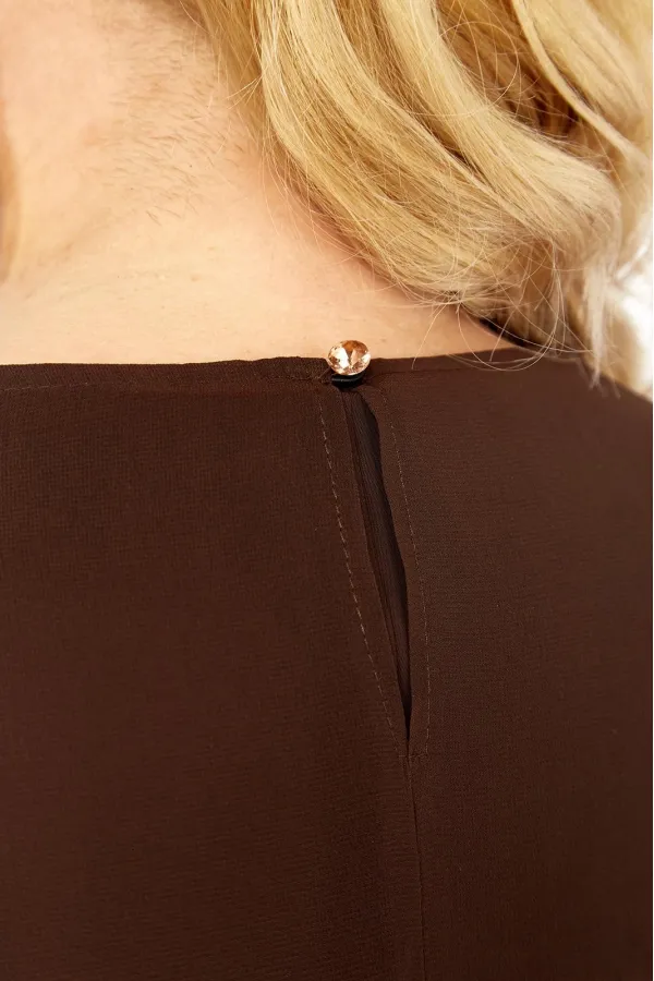 Блуза силуэта трапеция с втачными одношовными рукавами длиной 3/4,выполнена из гладкого шифона. Спинка удлиненная к центру, со средним швом и застёжкой на навесную петлю и пуговицу.Обтачка горловины переда,планки по низу блузы и рукавов, выполнены из отделочного шифона с бронзовым принтом