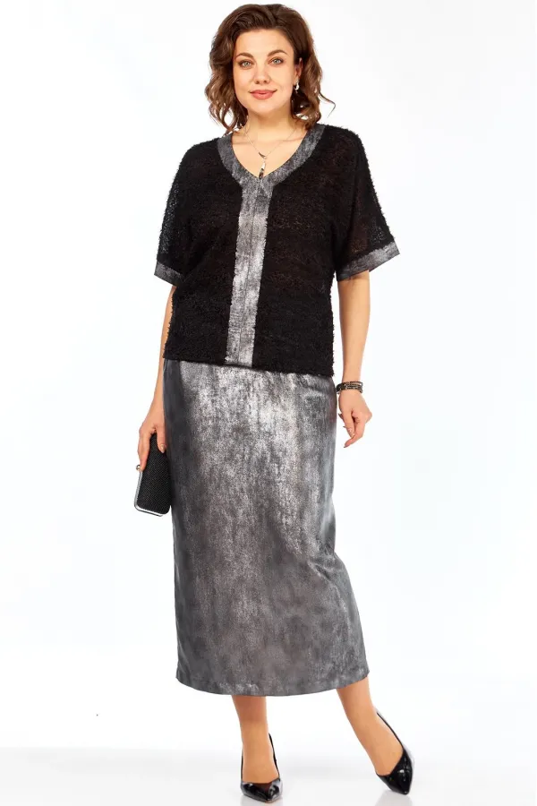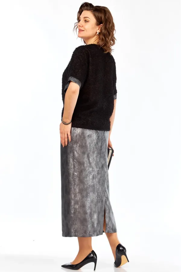 Юбка прямая,зауженная книзу, выполнена из отделочной ткани серебро с эффектом патины.Юбка с талиевыми вытачками ,на притачном поясе с резинкой в области боковых швов и застёжкой на тесьму-молнию и петлю и пуговицу. Заднее полотнище юбки со средним швом, заканчивающимся шлицей. Юбка на трикотажной подкладке.