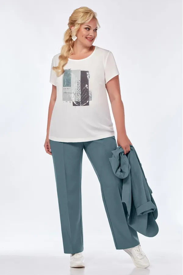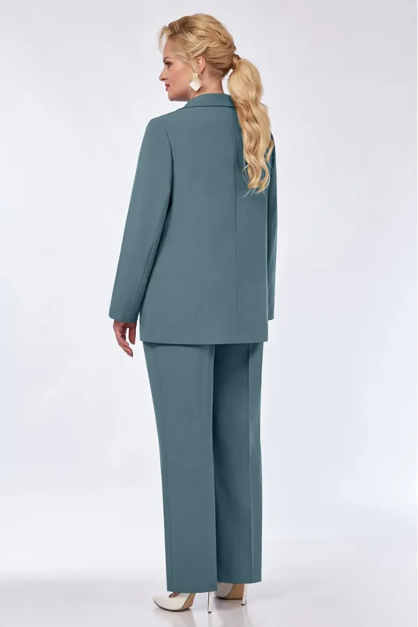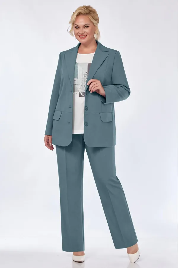 Костюм женский трёхпредметный состоит из жакета и брюк , выполненных из плательно-костюмной ткани и блузы, выполненной из блузочной ткани. Жакет прямого силуэта, с центральной застёжкой на 3 петли и пуговицы и воротником пиджачного типа с отложными лацканами. Перед с рельефами от плечевых швов до горизонтального подреза , расположенного ниже уровня талии, в шве выполнены карманы с клапанами и декоративными пуговицами. Спинка со средним швом. Рукава втачные, двухшовные, длинные ,с высокой подгибкой для возможности отвернуть манжет. Жакет на подкладке. Брюки прямые на притачном поясе с резинкой в области боковых швов и застёжкой на тесьму-молнию и 1 петлю и пуговицу по переду. Брюки со стрелками. Блуза из шёлковой блузочной ткани, с овальным вырезом горловины, со спущенным плечом. По переду обработаны нагрудные вытачки и выполнена декоративная печать.