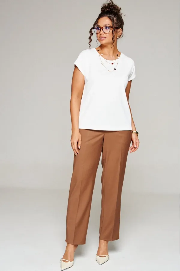 Брюки классические, укороченные; слегка зауженные к низу; с высокой посадкой и боковыми карманами в верхней части переда.