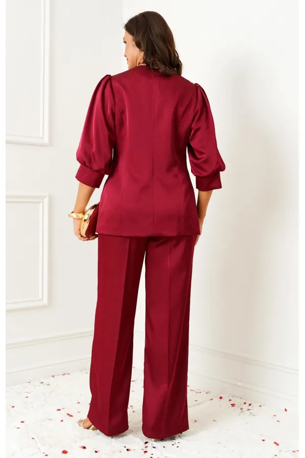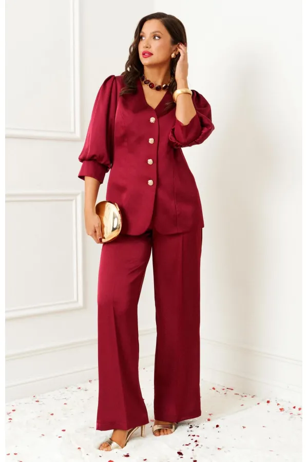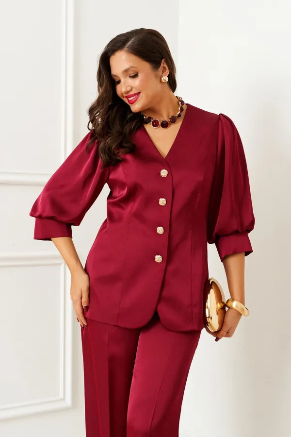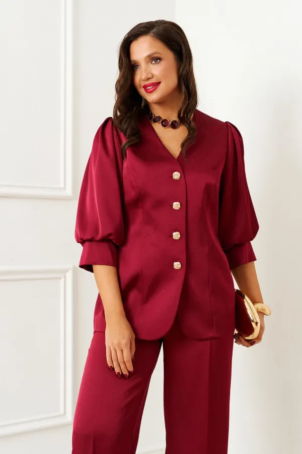 Костюм женский 2-ух предметный: жакет и брюки в деловом стиле. Выполнен из роскошного полотна «атлас» нежной и блестящей фактуры.