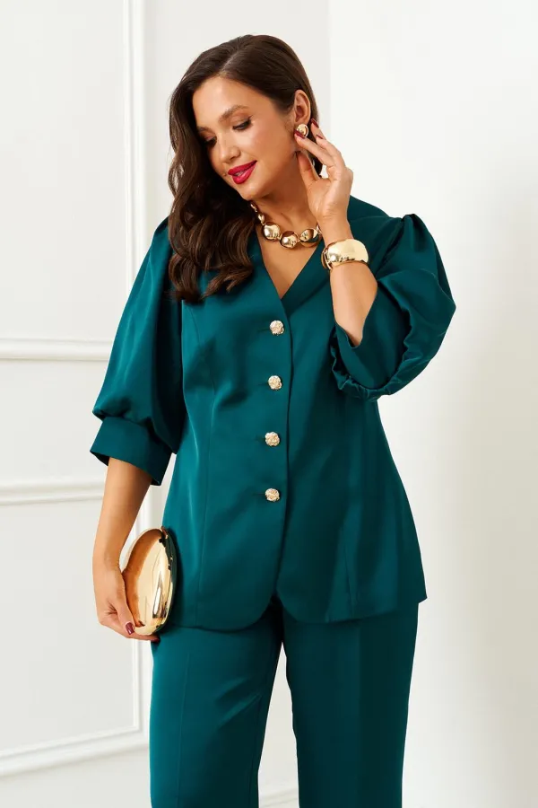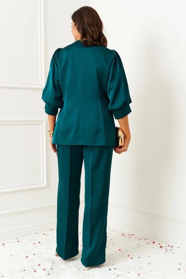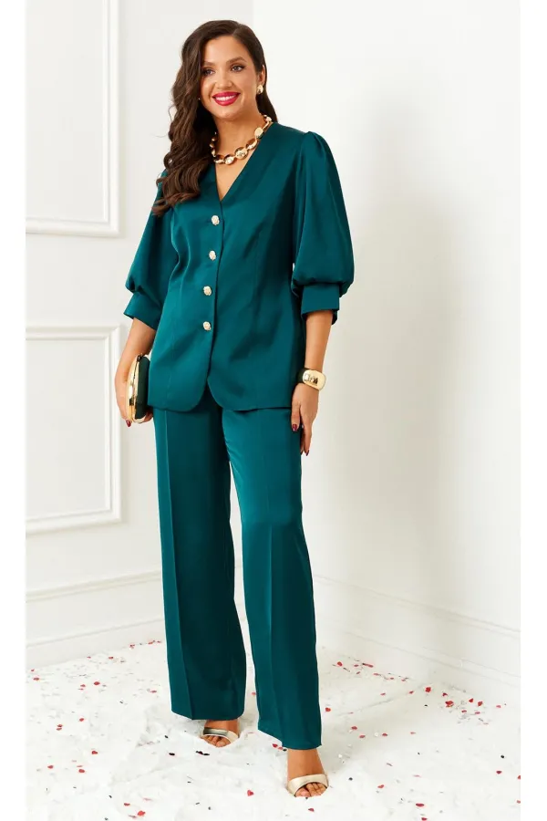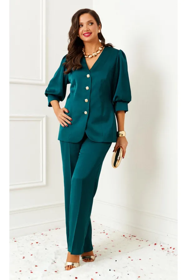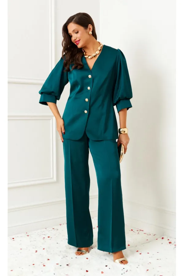 Костюм женский 2-ух предметный: жакет и брюки в деловом стиле. Выполнен из роскошного полотна «атлас» нежной и блестящей фактуры.