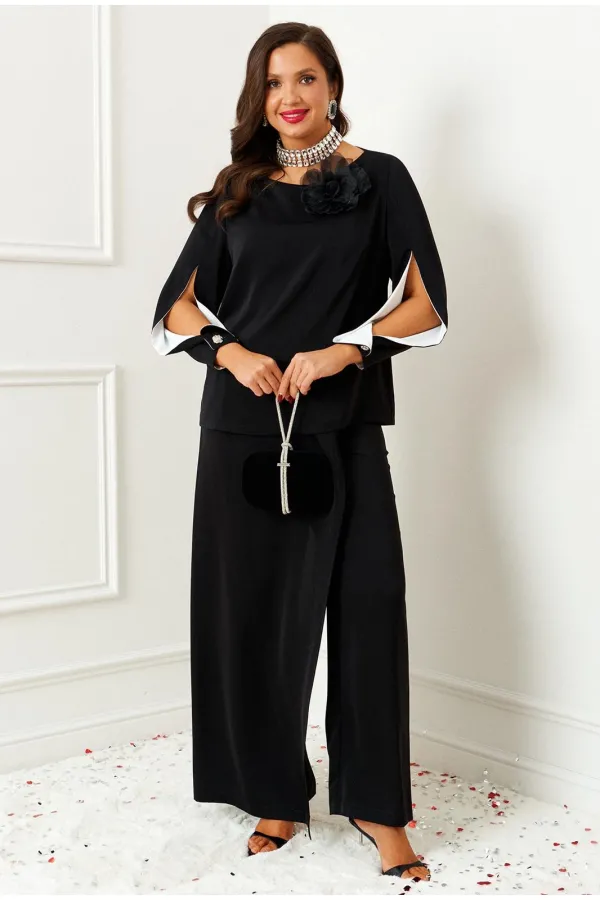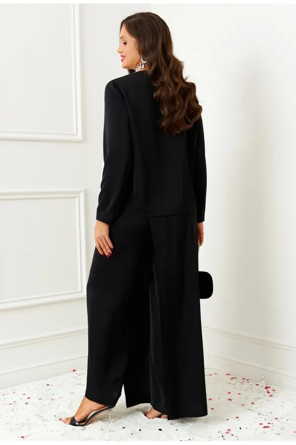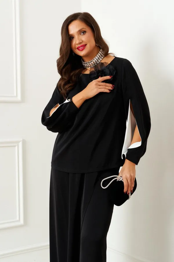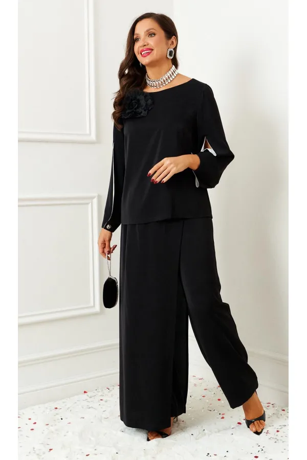 Изысканный нарядный костюм состоит из 2-ух предметов: блузки и брюк. Выполнен из костюмно-смесового полотна. У этой ткани нежная, гладко-бархатистая фактура, приятная на ощупь и матовая поверхность. Она легко драпируется и очень выгодно и дорого подчёркивает силуэт.