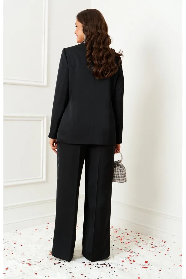 Элегантный костюм состоит из 2-х предметов одежды: жакета и брюк. Выполнен из шелковистого атласного полотна. Ткань легко драпируется и очень выгодно и дорого подчеркивает образ.