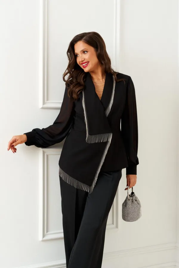 Костюм женский 2-ух предметный: жакет и брюки в деловом стиле. Выполнен в комбинации изысканных костюмного, атласного и шифонового полотен, а также декорирован эксклюзивной цепочной тесьмой.
