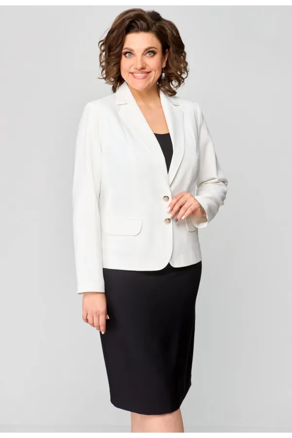 Комплект женский, 2-х предметный, из текстильной ткани, состоит из жакета и юбки. Жакет женский укороченный, на подкладке, полуприлегающего силуэта с центральной бортовой застежкой на пуговицы до линии перегиба лацкана. Спереди рельефные швы от плечевого шва, отрезной бочок и карман с клапаном. Спинка с рельефами от плечевого шва. Рукав втачной, двухшовный, по низу рукава обработана шлица на петли-пуговицы. Воротник пиджачного типа. Длина по спинке 57 см, длина рукава 62 см. Юбка прямого силуэта, из текстильной ткани, верхний срез юбки обработан обтачкой, заднее полотнище со средним швом, застегивается на потайную молнию. Шов переходит к низу в шлицу. По переднему и заднему полотнищах обработаны таливые вытачки. Длина по боковому шву 66 см. Юбка на подкладке.