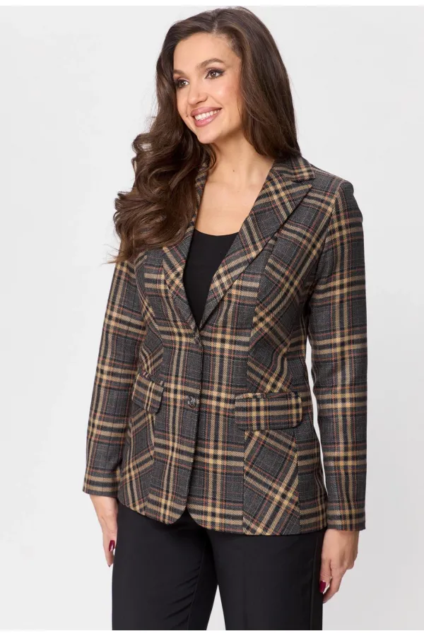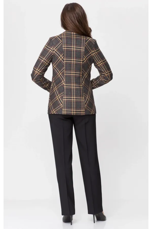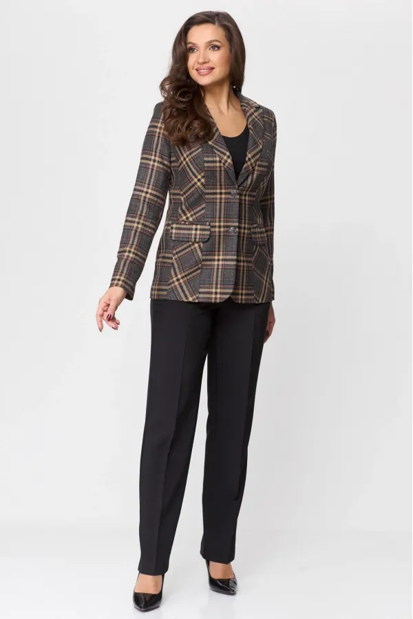 Комплект женский-двойка, из текстильной ткани, жакет удлиненный, полуприлегающего силуэта с центральной бортовой застежкой на пуговицы до линии перегиба лацкана. Спереди рельефные швы от плечевого шва, отрезной бочок и карман с клапаном. Спинка с рельефами от плечевого шва. Рукав втачной, двухшовный. Воротник пиджачного типа. Жакет на подкладке, длина по спинке 67 см, длина рукава 62 см. Брюки прямые,классические, с заутюженными стрелками,по переду обработаны карманы с отрезным бочком,застежка на тесьму-молнию и 1 пуговицу.На задних половинках обработаны вытачки и имитация карманов с листочкой, пояс в брюках притачной. Длина брюк от талии по боковому шву 100 см.