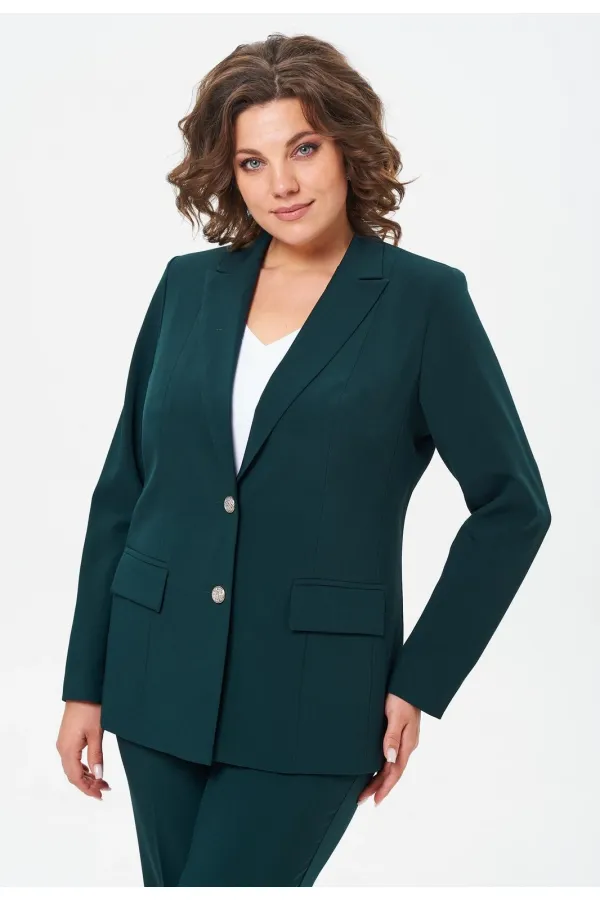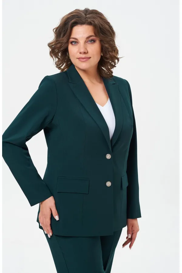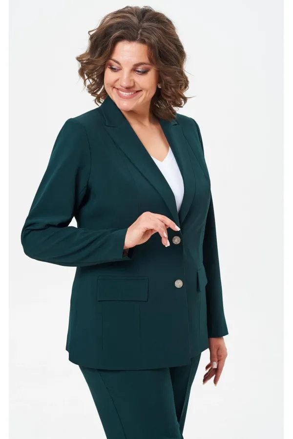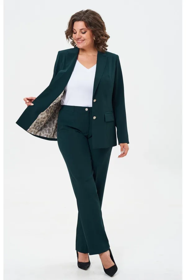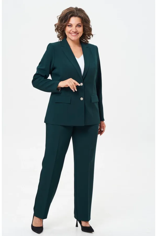 Комплект женский-двойка, из текстильной ткани, жакет удлиненный, полуприлегающего силуэта с центральной бортовой застежкой на пуговицы до линии перегиба лацкана. Спереди рельефные швы от плечевого шва, отрезной бочок и карман с клапаном. Спинка с рельефами от плечевого шва. Рукав втачной, двухшовный. Воротник пиджачного типа. Жакет на подкладке, длина по спинке 67 см, длина рукава 62 см. Брюки прямые, классические, с заутюженными стрелками, по переду обработаны карманы с отрезным бочком, застежка на тесьму-молнию и 1 пуговицу. На задних половинках обработаны вытачки и имитация карманов с листочкой, пояс в брюках притачной. Длина брюк от талии по боковому шву 103 см.
