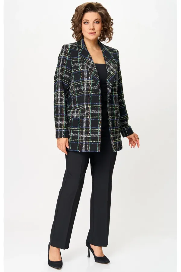 Комплект женский-двойка,из костюмной ткани, жакет удлиненный, свободного силуэта с центральной бортовой застежкой на пуговицы до линии перегиба лацкана. По переду имеется отрезной бочок и вертикальные вытачки. С прорезными карманами с клапаном и двумя обтачками. Спинка цельная. Воротник пиджачного типа. Рукав двухшовный, втачной. Жакет на подкладке. Длина рукава 63 см, длина по спинке 75 см. Брюки прямые, классические, из текстильной ткани, с заутюженными стрелками, по переду обработаны карманы с отрезным бочком, застежка на тесьму-молнию и 1 пуговицу. На задних половинках обработаны вытачки и имитация карманов с листочкой, пояс в брюках притачной. Длина брюк от талии по боковому шву 103 см.