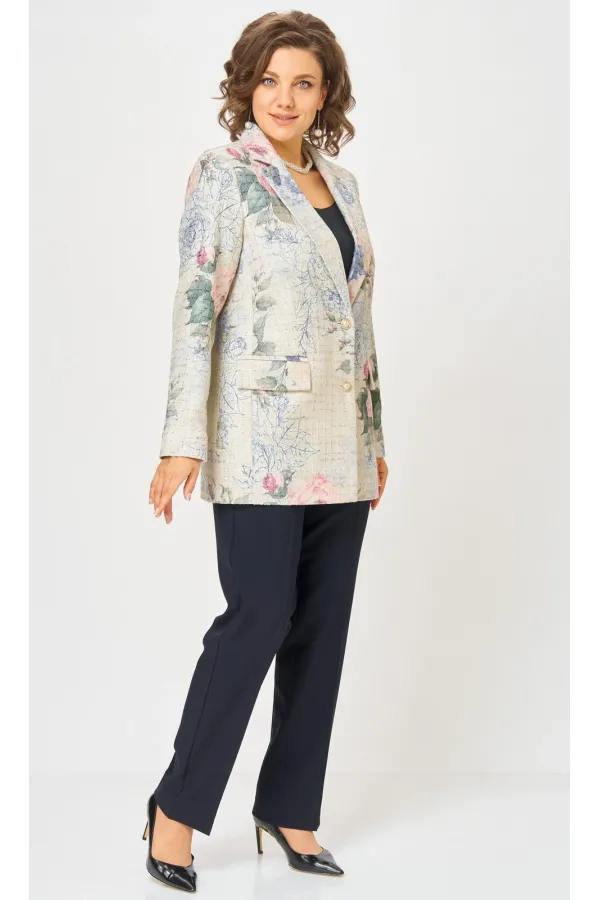 Этот двухпредметный комплект— основа безупречного гардероба.Жакет— воплощение уютной элегантности. Выполненный из фактурного твида, он сочетает в себе непринужденность свободного силуэта и безупречную классику кроя. Идеален для создания как повседневных, так и собранных образов. Воротник пиджачного типа, застежка до линии лацкана и изящные прорезные карманы с клапанами делают образ законченным и утонченным, жакет полностью на подкладке. Длина по спинке 75 см, длина рукава 63 см. Брюки классические прямые с заутюженными стрелками, которые визуально вытягивают силуэт. Скрытая резинка по бокам гарантирует невероятный комфорт, сохраняя безупречный вид спереди. По переду обработаны карманы с отрезным бочком, застежка на тесьму-молнию и 1 пуговицу. На задних половинках обработаны вытачки и имитация карманов с листочкой. Длина брюк от талии по боковому шву 103 см.