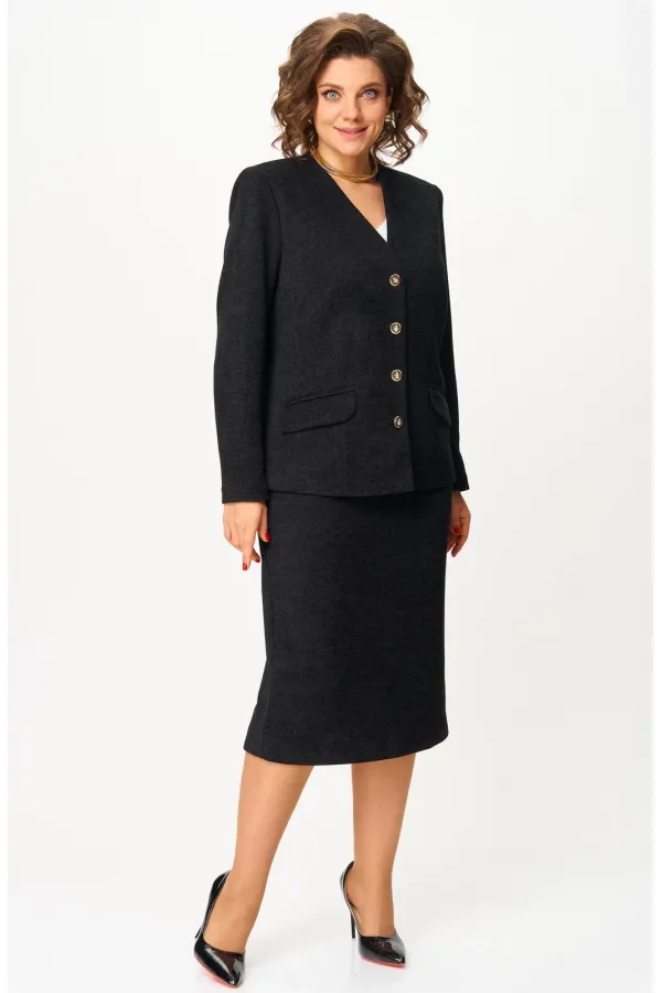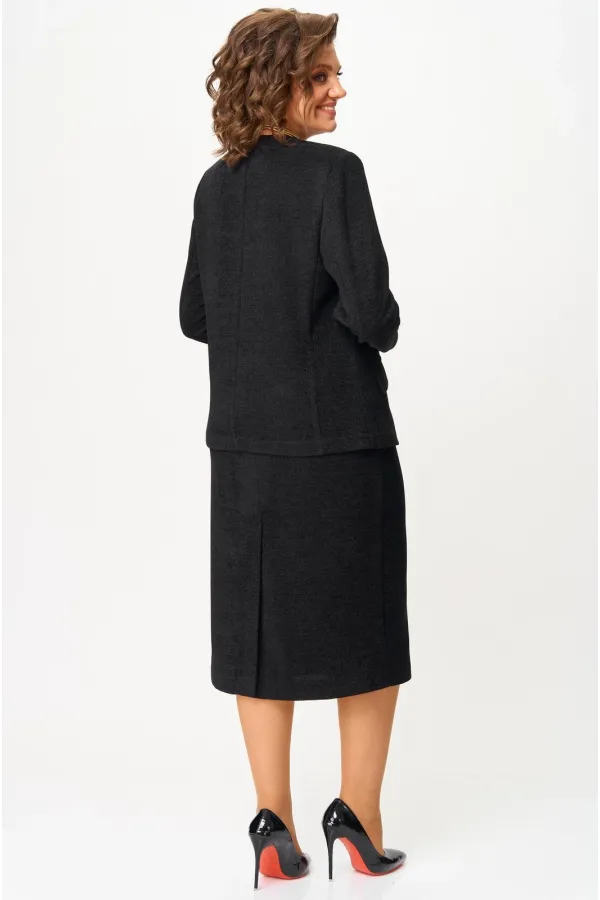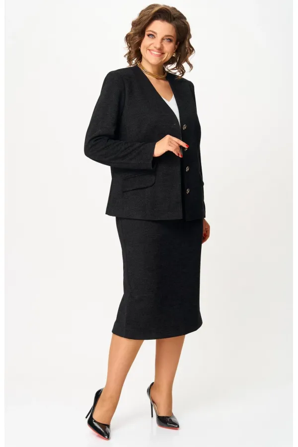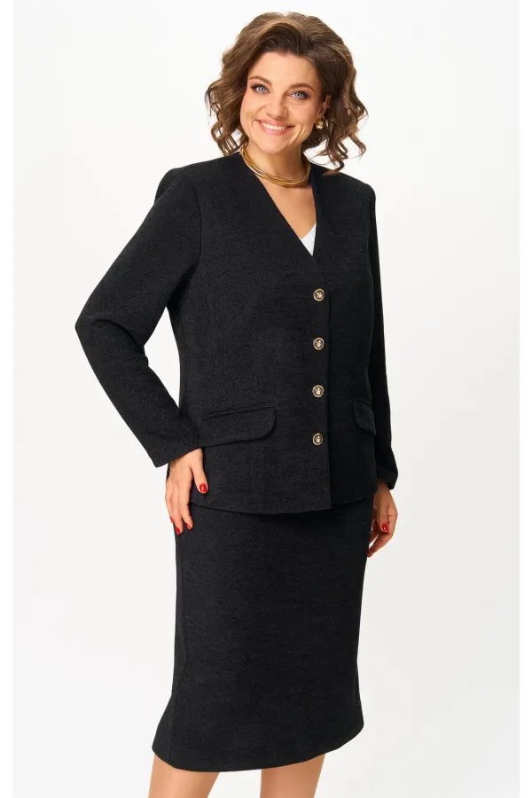 Комплект женский-двойка,из плотного трикотажа, Жакет классический, с V-образным вырезом, полуприлегающего силуэта с центральной бортовой застежкой на петли-пуговицы. Спереди рельефные швы отпроймы, талиевая вытачка и карман с клапаном. Спинка со средним швом и рельефами от проймы. Рукав втачной, двухшовный. Перед жакета на подкладке. Длина рукава 61 см, длина жакета по спинке 62 см. Юбка прямого силуэта, удлиненная, верхний срез юбки обработан обтачкой, имеются талиевые вытачки, заднее полотнище со средним швом, застегивается на потайную молнию. Шов переходит к низу в шлицу. Длина по боковому шву 79 см. Юбка на подкладке.